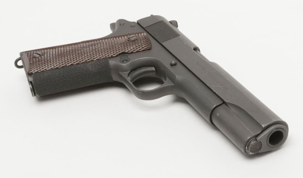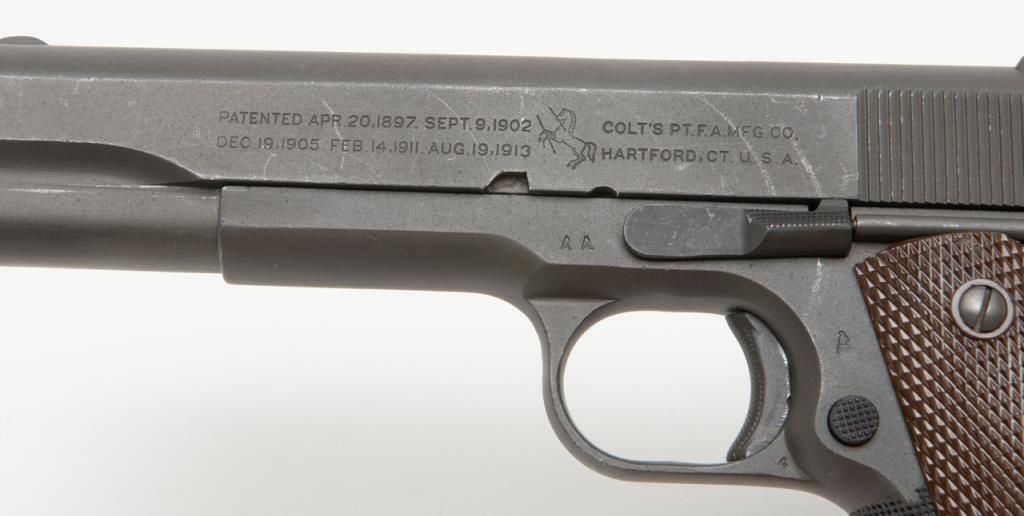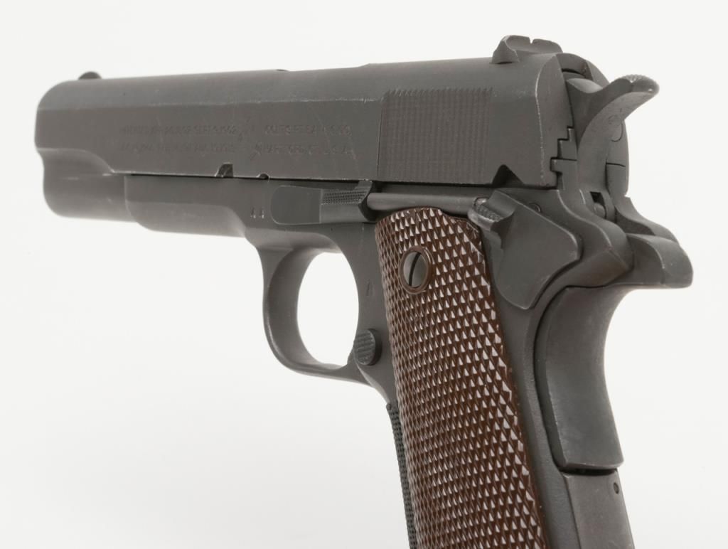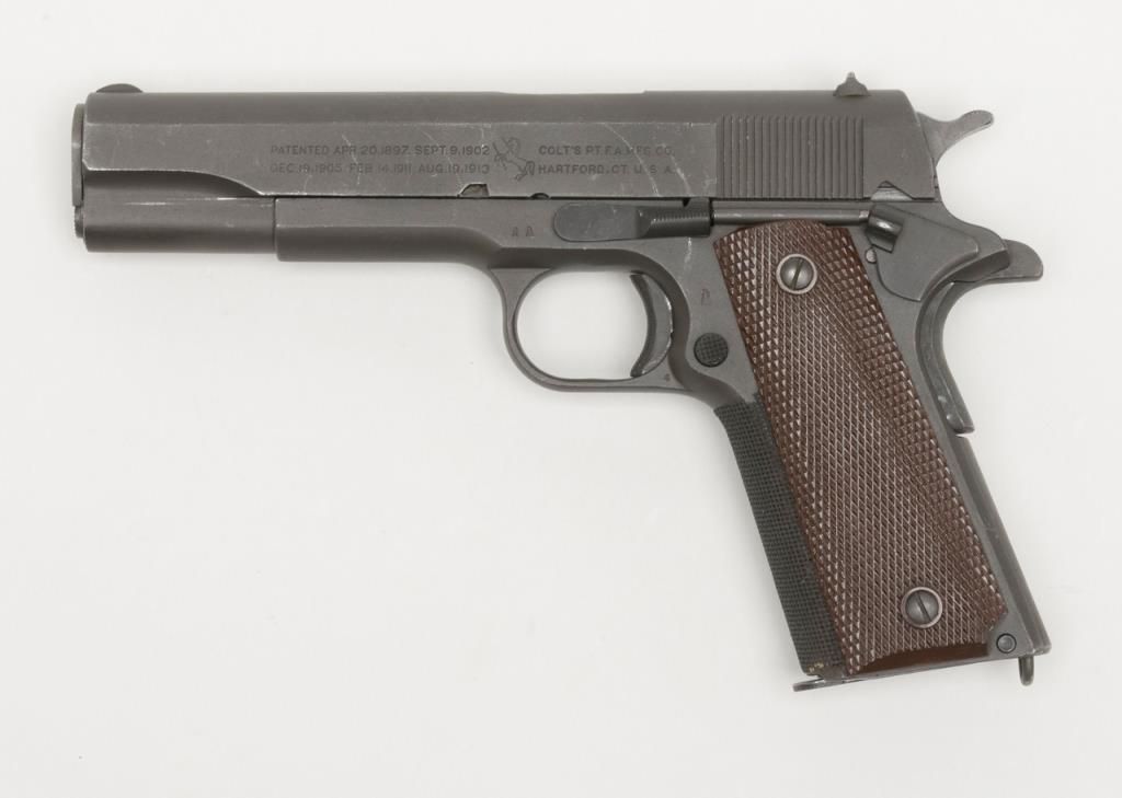 United States Property Colt Model 1911 semi-auto pistol, .45 cal., 5” barrel, re-work by Augusta Arsenal, parkerized military finish, checkered brown plastic fiber grips, #517452 in overall very good condition showing the majority of itsmilitary re-finish, very good bore, very good markings, front grip strap has had a piece of grip fiber added to it; crisp action, unmarked single tone magazine. From the estate of Joe Kiser. (C&R). Est.: $1,000-$2,000.