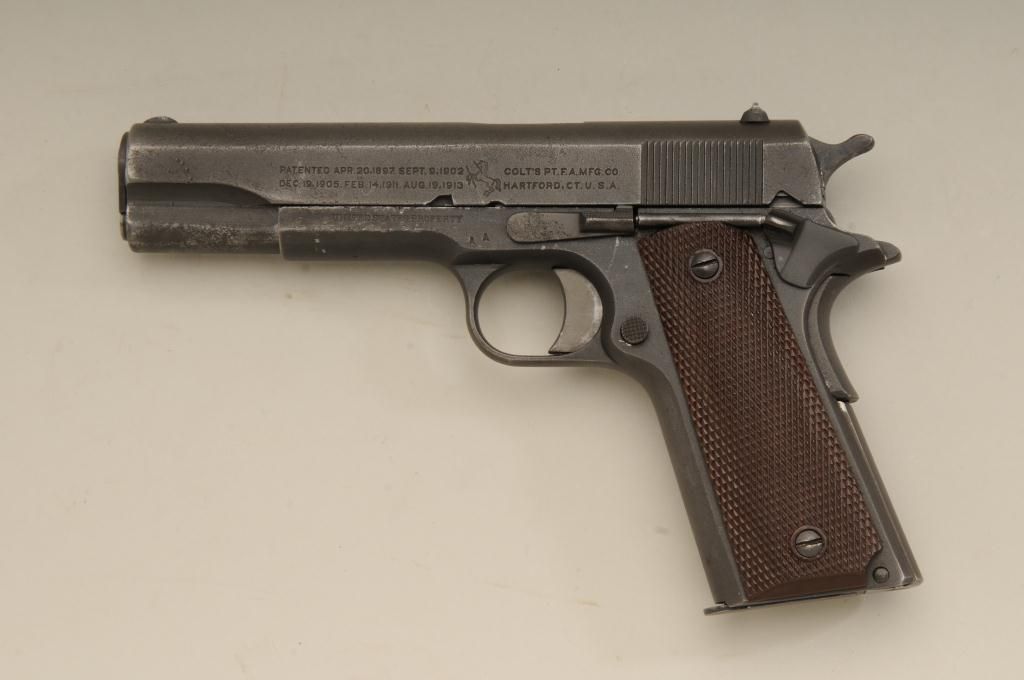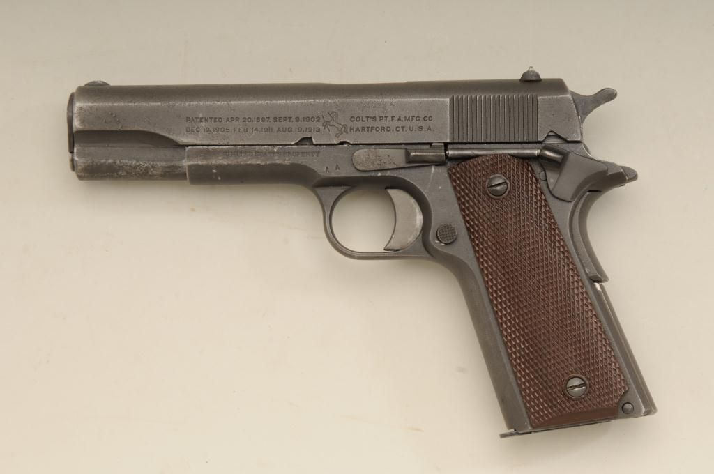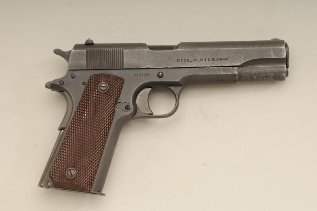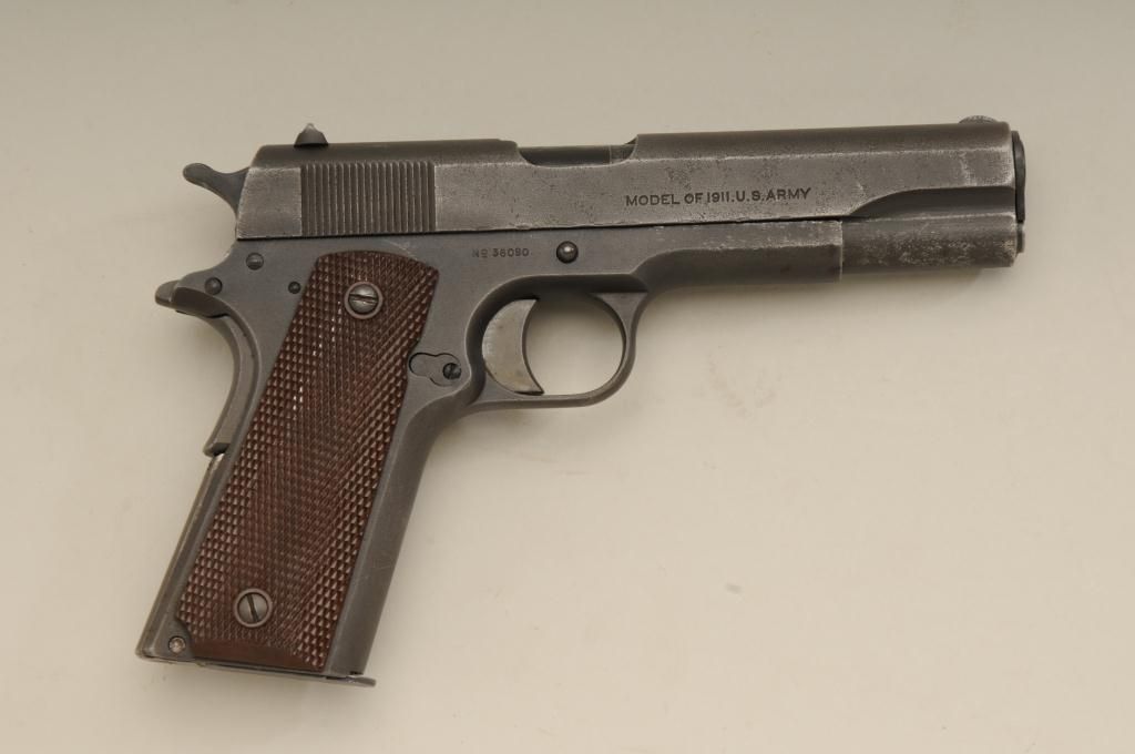 United States Property Model 1911 semi-auto pistol by Colt, .45 cal., 5” barrel, re-finished in parkerized manner (left side of frame stamped “AA”), checkered brown plastic later style military grips, #36090.This gun is in overall good condition as apparently arsenal re-furbished with a good bore, action, markings and very good grips; considerable parkerization remains with high point and muzzle wear over scattered pittingto metal surfaces confined primarily to the front end of the pistol, slide and slide stop. Est.: $750-$1,500.