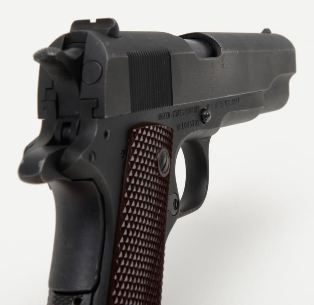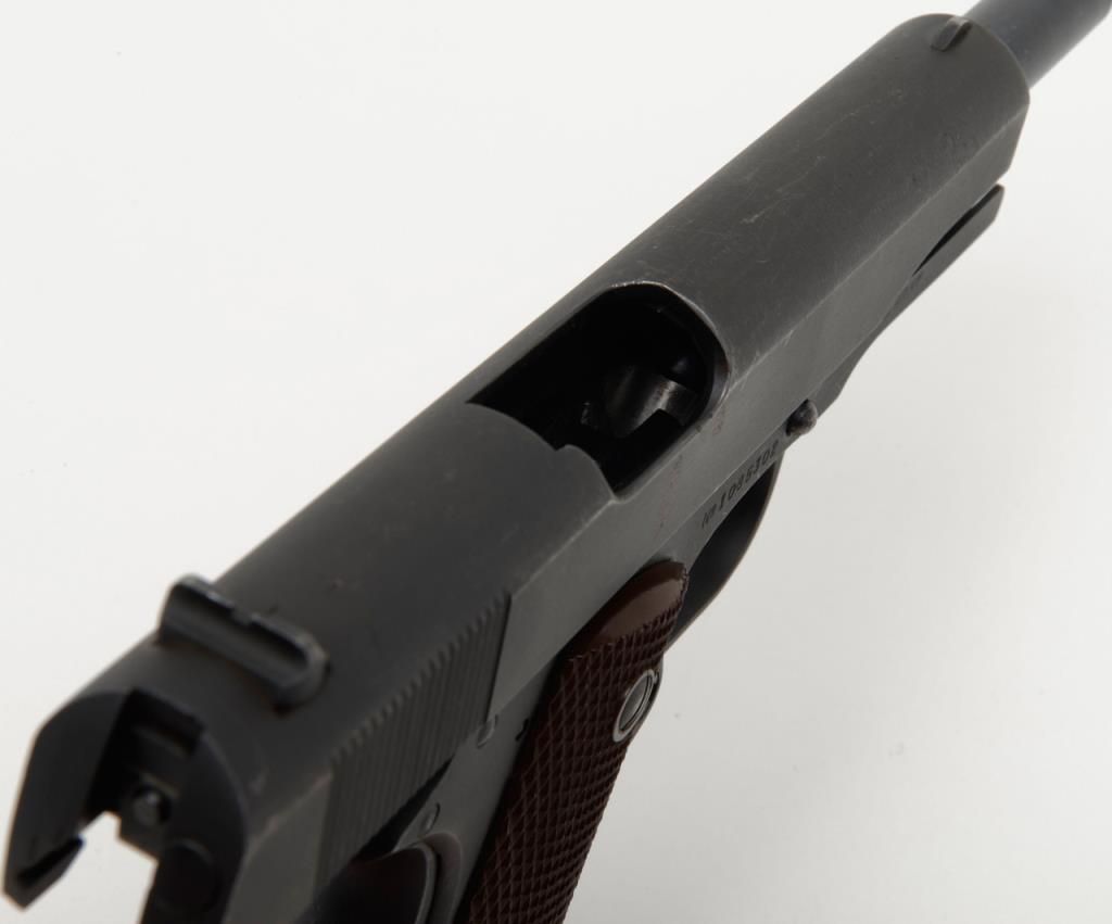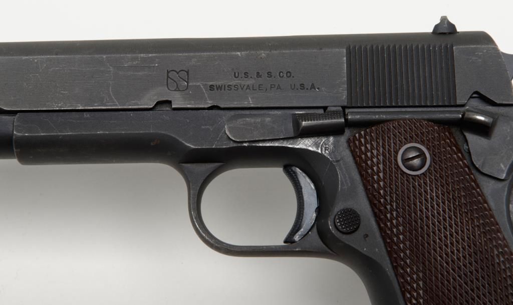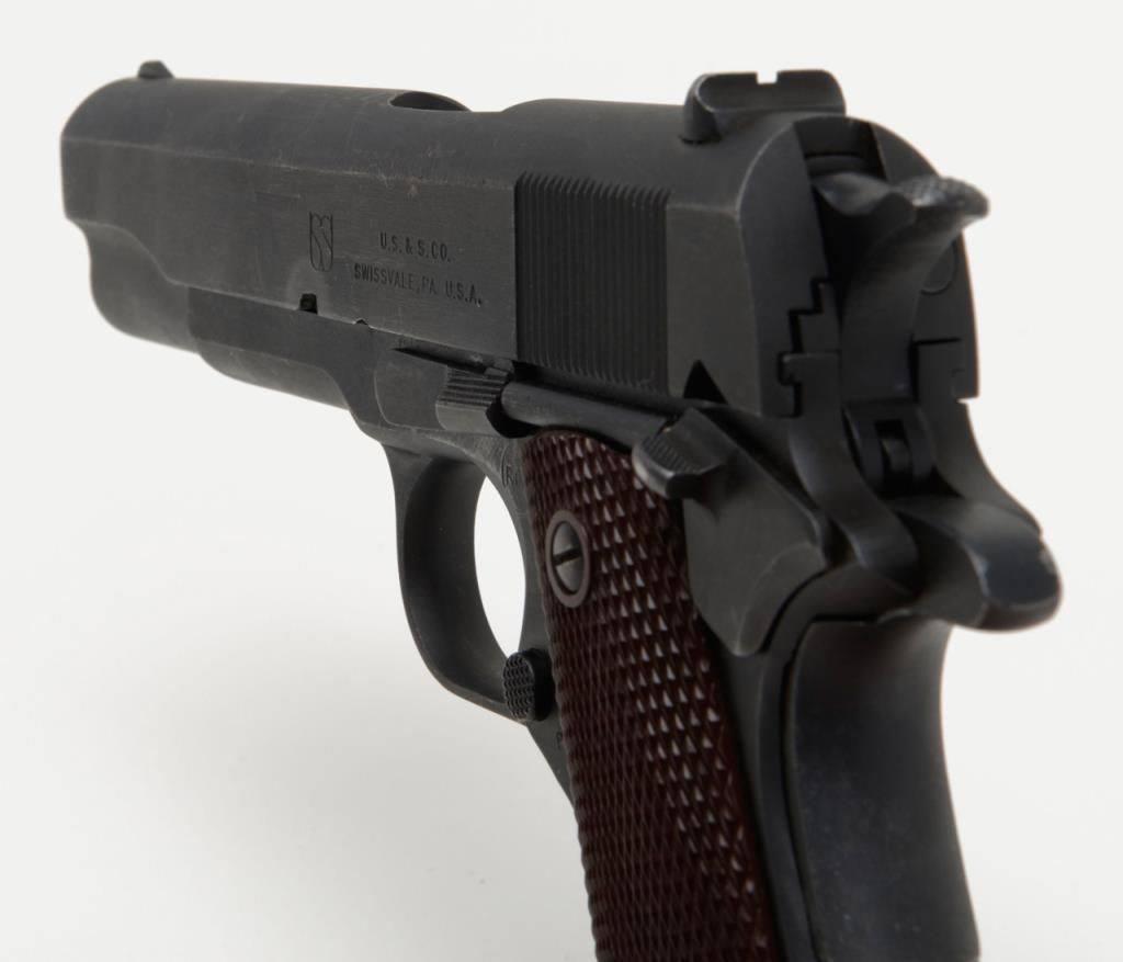 United States Property Union Switch & Signal Model 1911-A1 semi-auto pistol, .45 cal., 5” barrel, parkerized finish, checkered brown plastic grips, #1085302 in overall very good + to near fine condition showing the majority of its militaryfinish with high point wear and two light spots of erosion on the right side of the slide at the ejection port; crisp action, sharp markings, fine bore, fine grips. Only approx. 55,000 pistols of this maker were delivered in 1943 making the US&Sone of the most sought after of all the 1911/1911-A1 WW II military sidearms by serious collectors. (C&R). Est.: $3,000-$6,000.