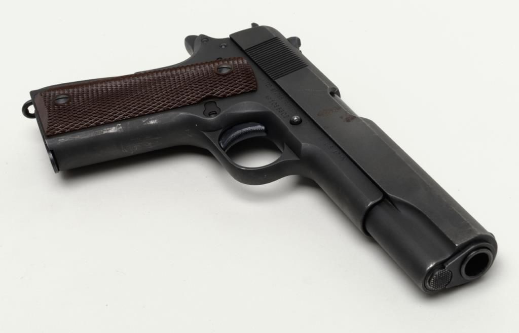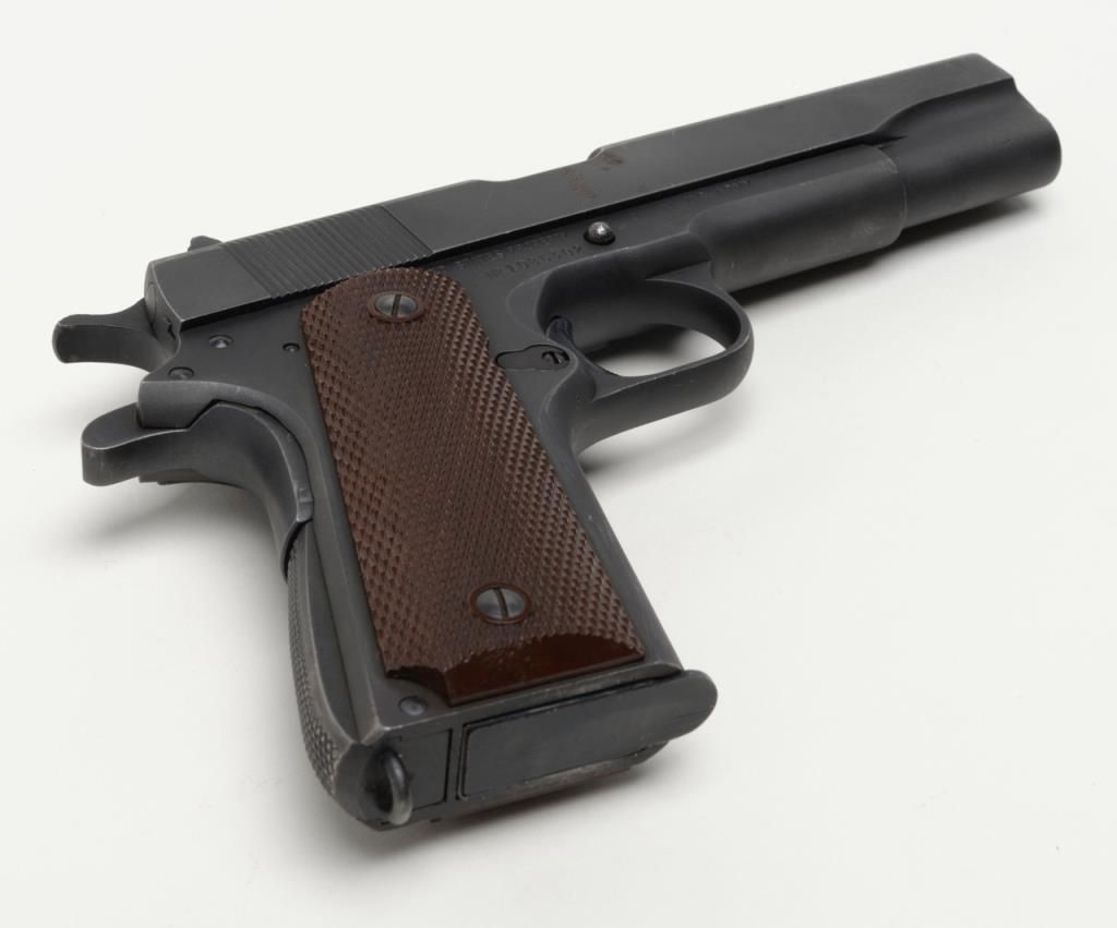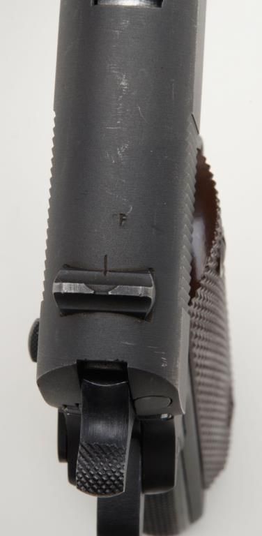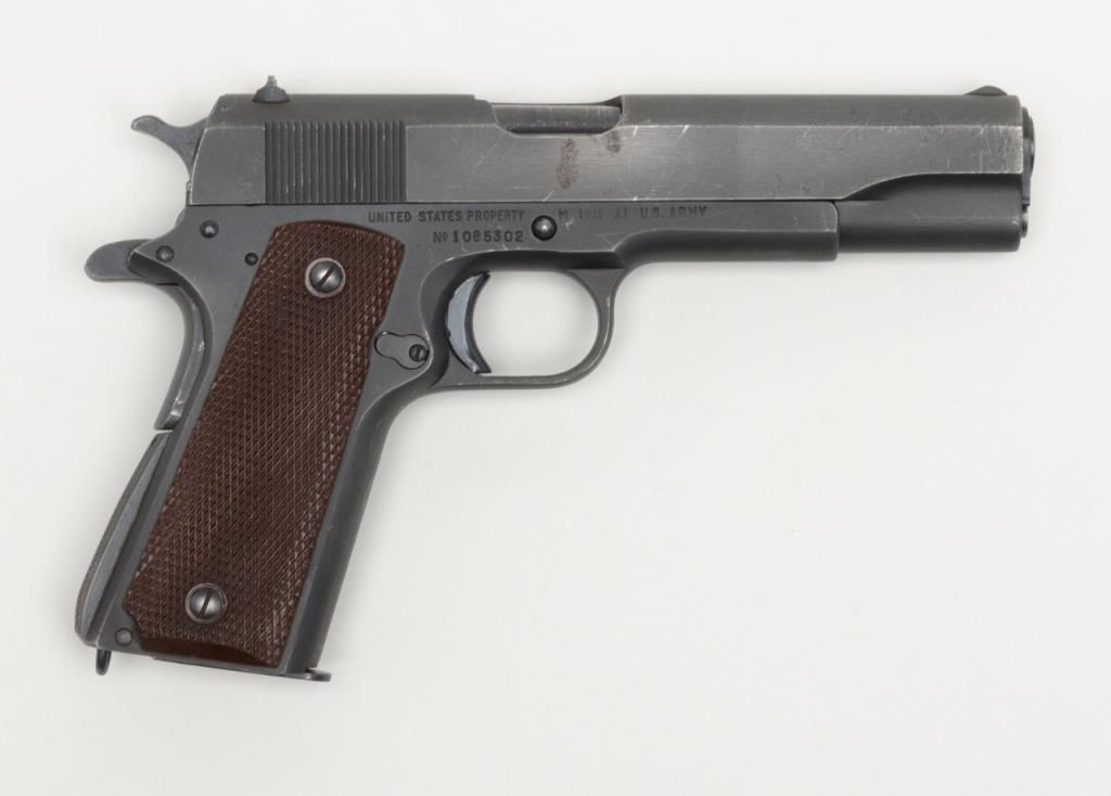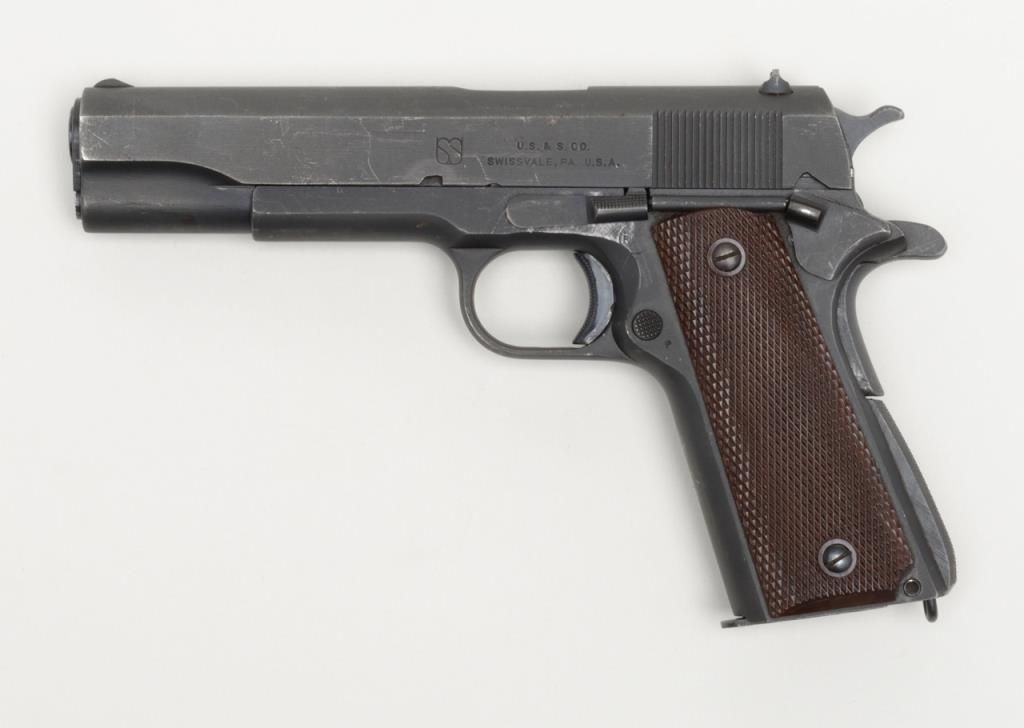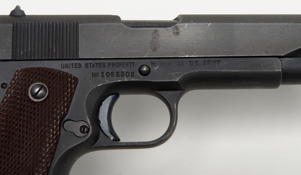 United States Property Union Switch & Signal Model 1911-A1 semi-auto pistol, .45 cal., 5” barrel, parkerized finish, checkered brown plastic grips, #1085302 in overall very good + to near fine condition showing the majority of its militaryfinish with high point wear and two light spots of erosion on the right side of the slide at the ejection port; crisp action, sharp markings, fine bore, fine grips. Only approx. 55,000 pistols of this maker were delivered in 1943 making the US&Sone of the most sought after of all the 1911/1911-A1 WW II military sidearms by serious collectors. (C&R). Est.: $3,000-$6,000.