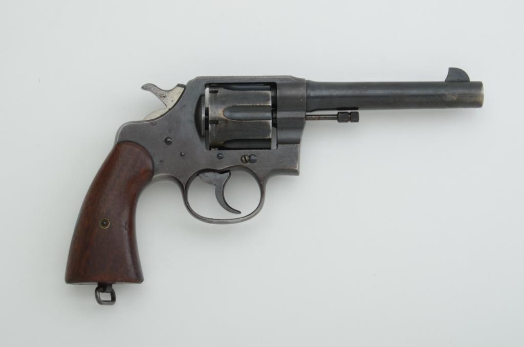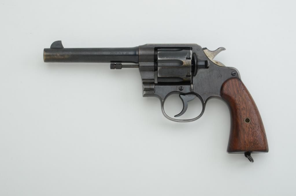United States Property-marked Colt Model 1917 DA revolver, .45 cal., 5-1/2” barrel, military blue finish, wood grips, #61779. This gun is in overall uncleaned fine condition showing approx. 75%+ originalfinish, bore should clean to fine, crisp action, very good markings, fine grips. Est.: $600-$1,200.
