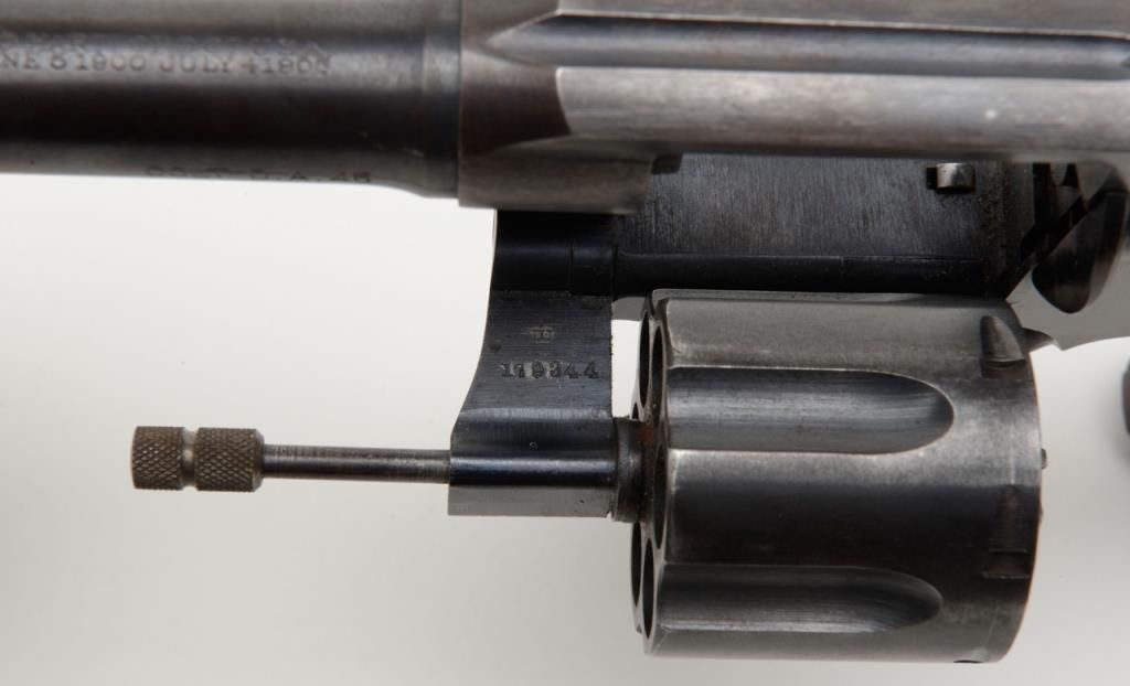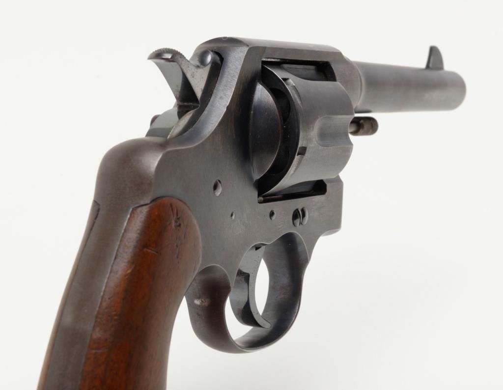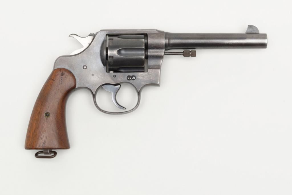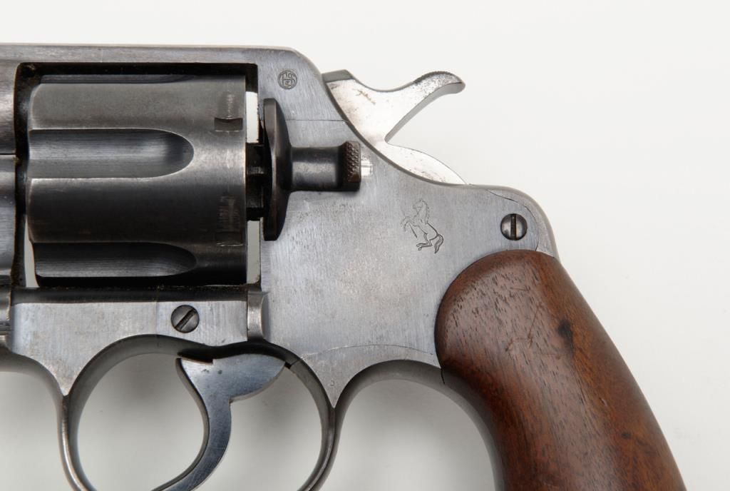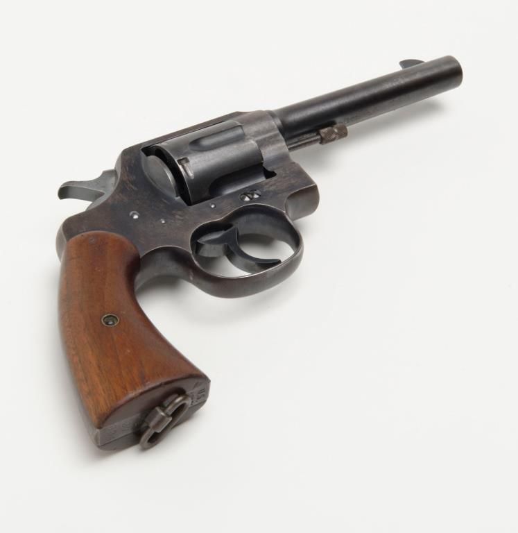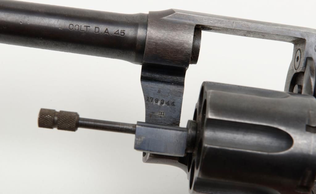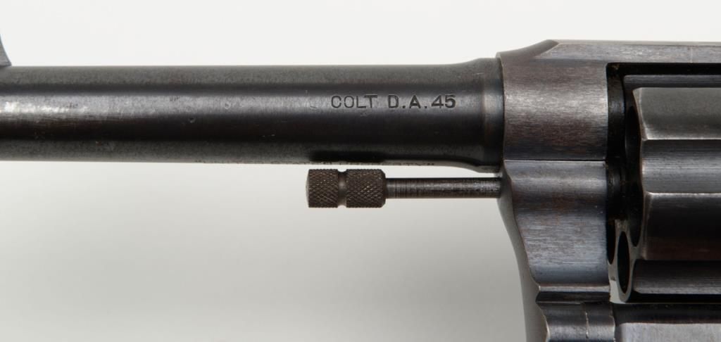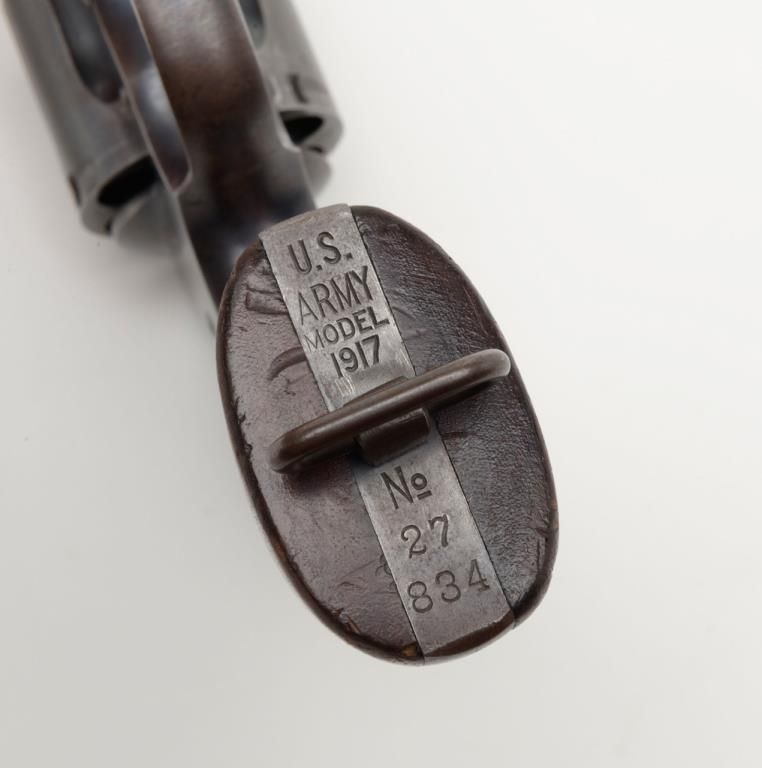 United States Property marked Colt Model 1917 DA revolver, .45 cal., 5-1/2” barrel, military blue finish, wood grips, lanyard ring, #27834 in overall very good to fine condition showing the majority of its original finish, crisp action,markings and very good bore with a couple spots of pitting; very good + grips; from an old California bay area estate. (C&R). Est.: $600-$1,200.