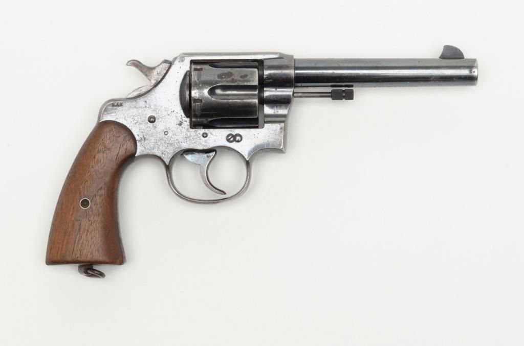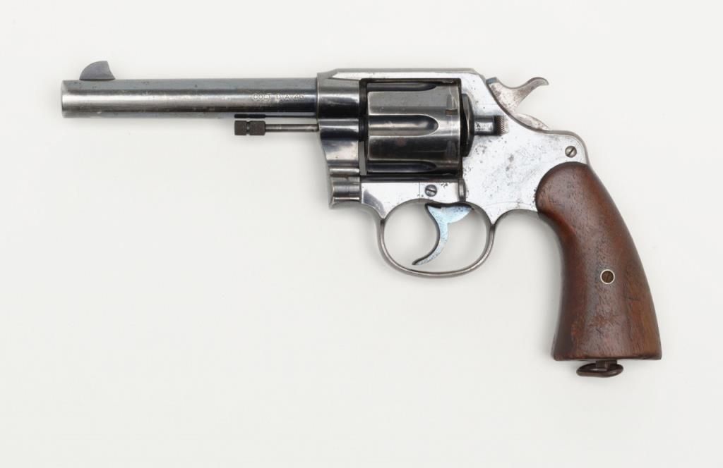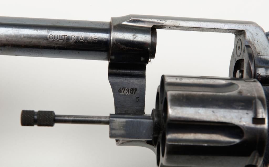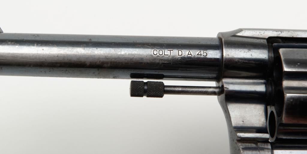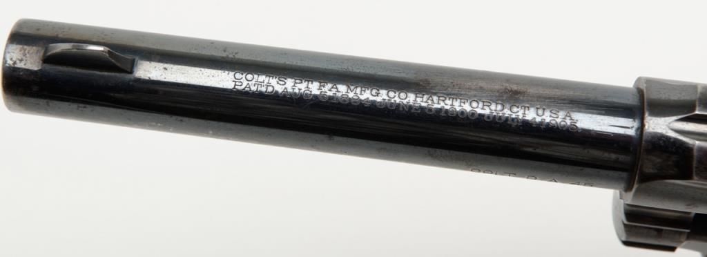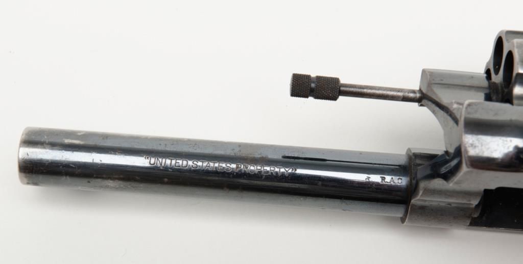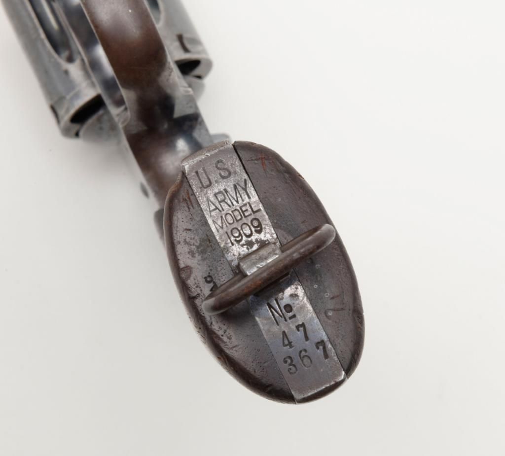 United States Property marked Colt U.S. Army Model 1909 DA revolver, .45 cal., 5-1/2” barrel, blue finish, wood grips, lanyard ring, #47367 in overall very good to near fine condition showing considerable original bright blue finish, correctinspector’s markings on frame and bottom of grips, good bore, crisp action, sharp markings and very good grips; from an old California bay area estate. (C&R). Est.: $800-$1,600.