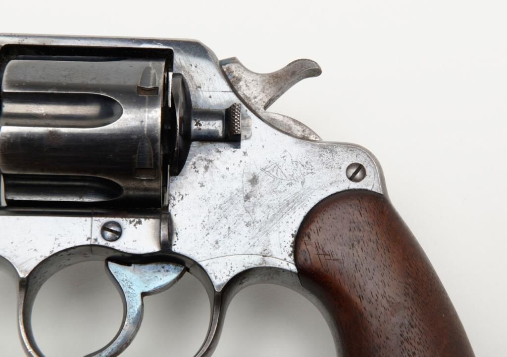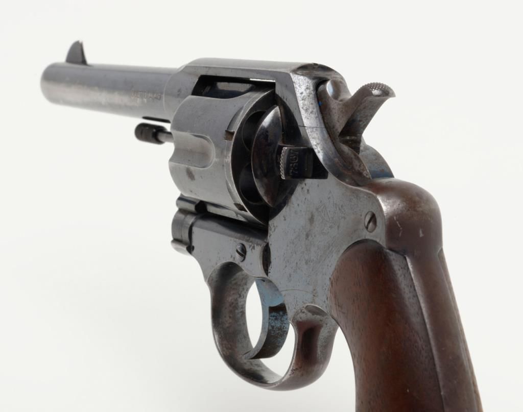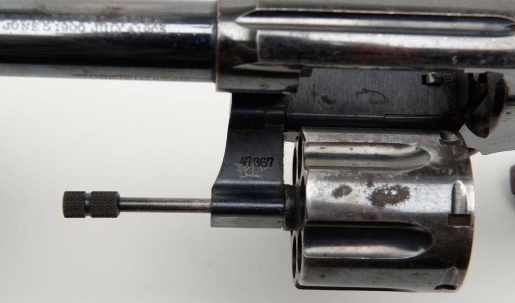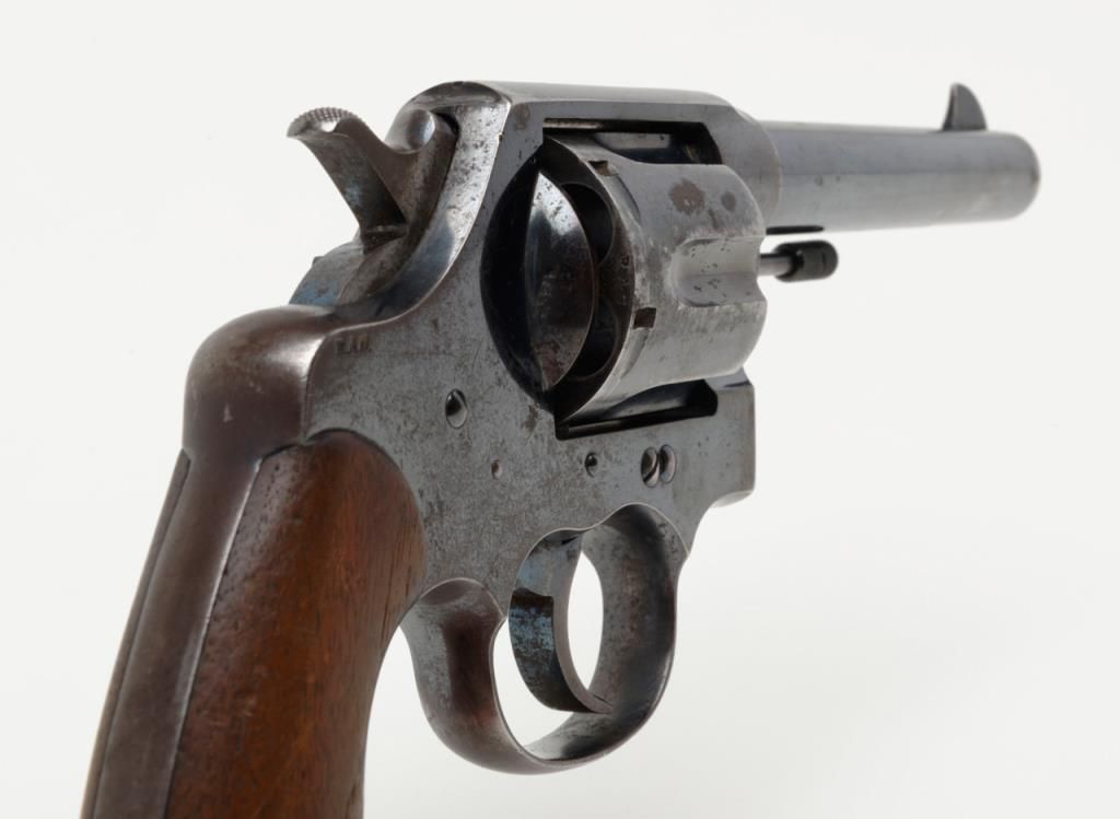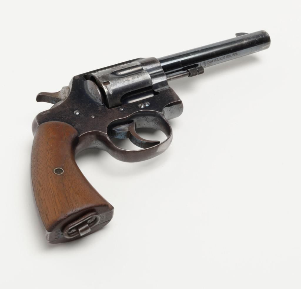 United States Property marked Colt U.S. Army Model 1909 DA revolver, .45 cal., 5-1/2” barrel, blue finish, wood grips, lanyard ring, #47367 in overall very good to near fine condition showing considerable original bright blue finish, correctinspector’s markings on frame and bottom of grips, good bore, crisp action, sharp markings and very good grips; from an old California bay area estate. (C&R). Est.: $800-$1,600.