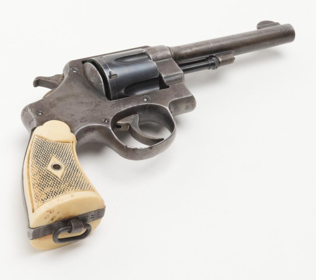 United States Property marked Model 1917 Army DA revolver, .45 cal., 5-1/2” barrel, blue finish, replacement checkered faux ivory grips, lanyard ring, #37655 in overall fair to good condition showing some blue with scattered areas of pitting, good action and markings, very good bore, good replacement grips. (C&R/PPT). Est.: $250-$500.