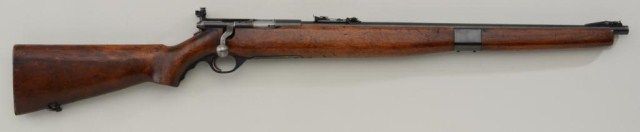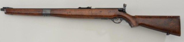 United States Property marked Mossberg Model 42M-B bolt action rifle, .22 cal., 22-1/2” barrel, blue finish, wood stock, no magazine, #11091 (also interestingly British proofed). This gun is in overall very good conditionshowing the majority of its blue finish, very good bore, crisp action, sharp markings and good wood with scattered mars and scratches from carry and storage; adjustable receiver-mounted rear sight. Est.:$200-$400.