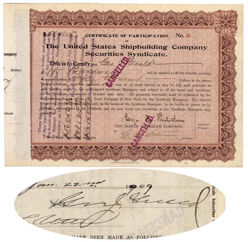 1902, New York. $50,000 certificate from the United States Shipbuilding Company Securities Syndicate. Brown. Ornate border. Issued to and signed on verso by GEORGE JAY GOULD (1864-1923) Financier and son of Jay Gould. George Gould was a railroad executive who led both the Denver and Rio Grande Western Railroad and the Western Pacific Railroad Stamp cancelled and excellent.