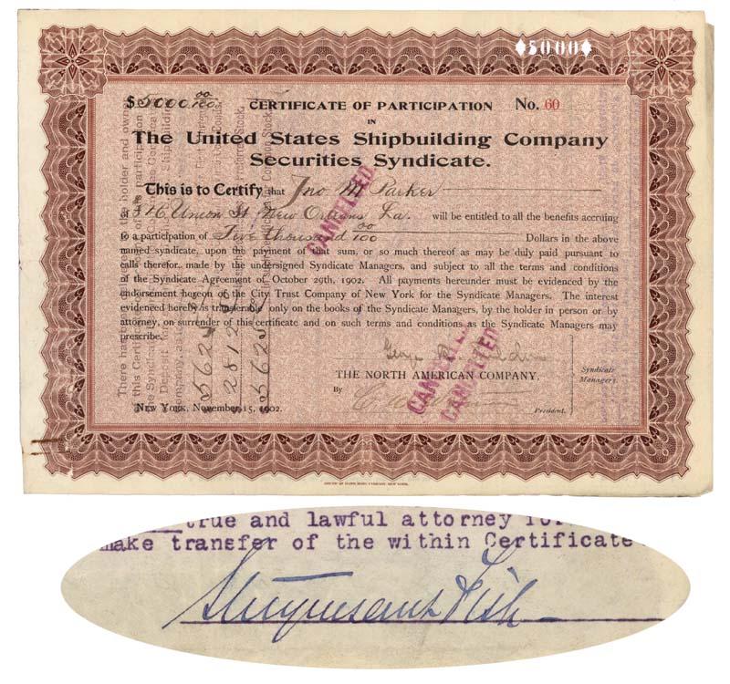 1902, New York. $5000 certificate from the United States Shipbuilding Company Securities Syndicate. Brown. Ornate border. Signed on verso as attorney by STUYVESANT FISH (1851-1923) President of the Illinois central Railroad. Light staining from paper clip. Overall Extremely Fine.