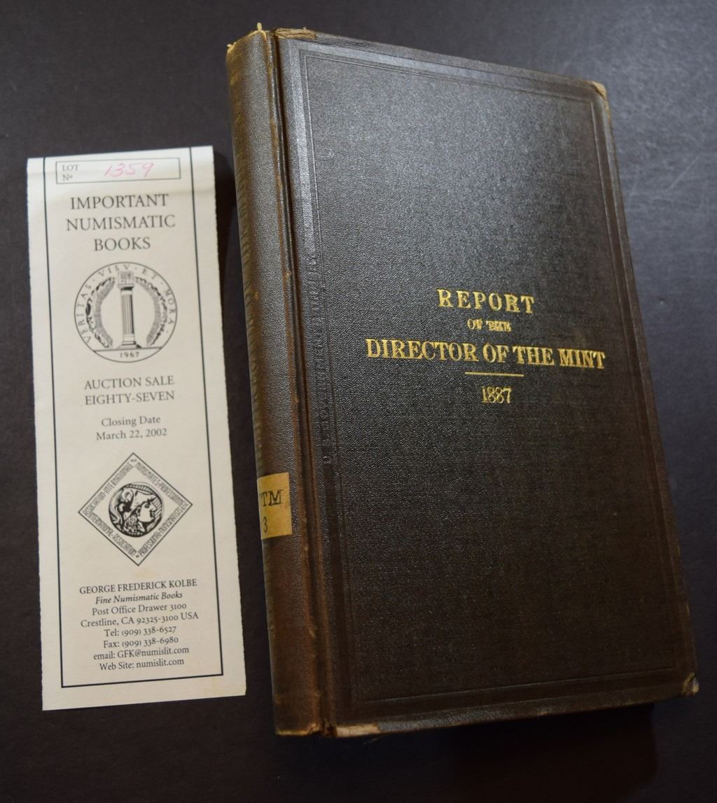 United States Treasury Department. ANNUAL REPORT OF THE DIRECTOR OF THE MINT TO THE SECRETARY OF THE TREASURY FOR THE FISCAL YEAR ENDED JUNE 30, 1887. Washington: Government Printing Office. 1887. 12mo. 382 pages. Original black blind-stamped cloth, gilt. Library markings on spine. Very Good. Treasury Department, Document No. 1054. Tables. Index. The U.S. Mint Report consists primarily of the Mint Director's annual report to the Secretary of the Treasury, this series contains information often found nowhere else, revealing internal workings of the Mint and copious statistical data. In addition to the annual reports, this series includes other reports as issued, for example, results of assay tests of foreign gold and silver coins. ex Holvoke Public Library. ex Kolbe Sale No. 87 Lot 1359. Lot weight: 1 lbs 7oz. Subject(s): Mint Report - United States.