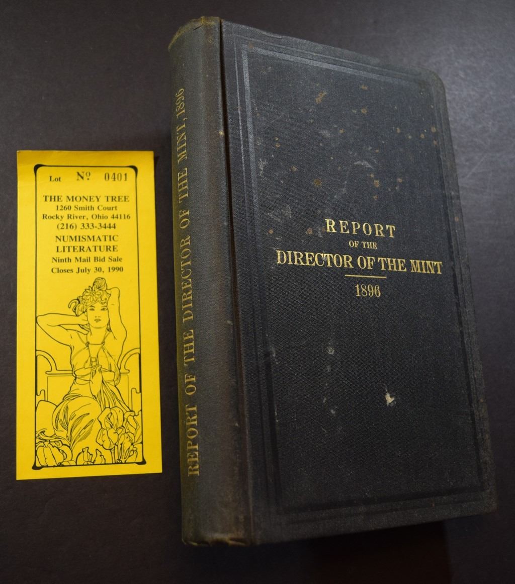 United States Treasury Department. ANNUAL REPORT OF THE DIRECTOR OF THE MINT TO THE SECRETARY OF THE TREASURY FOR THE FISCAL YEAR ENDED JUNE 30, 1896. Washington: Government Printing Office. 1896. 12mo. 591 pages. Original black blind-stamped cloth, gilt. Fine. Treasury Department, Document No. 1924. Tables. Index. The U.S. Mint Report consists primarily of the Mint Director's annual report to the Secretary of the Treasury, this series contains information often found nowhere else, revealing internal workings of the Mint and copious statistical data. In addition to the annual reports, this series includes other reports as issued, for example, results of assay tests of foreign gold and silver coins. This volume is particularly important for the additional articles included within: 'History of the Motto 'In God We Trust'', 'Theory and History of Coinage' derived from an article by Professor Lexis; 'From Mine to Mint' an illustrated article by D. K. Tuttle; 'Assaying of Gold and Silver' an illustrated article by Jacob Eckeldt; and correspondence pertaining to proposed revision of the Mint and coinage laws of the United States. ex Money Tree Sale No. 9 Lot 401. Lot weight: 2 lbs 2oz. Subject(s): Mint Report - United States.