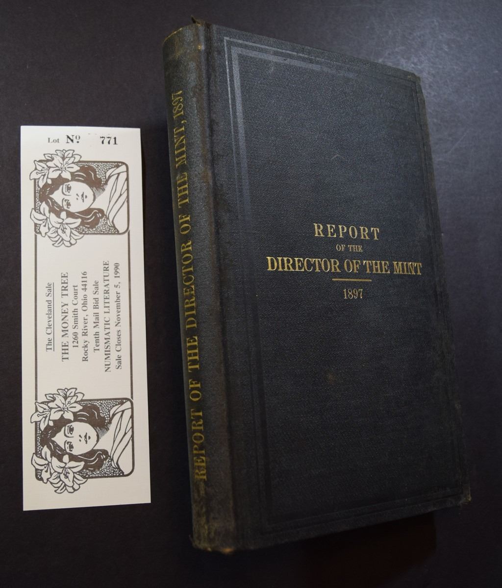 United States Treasury Department. ANNUAL REPORT OF THE DIRECTOR OF THE MINT TO THE SECRETARY OF THE TREASURY FOR THE FISCAL YEAR ENDED JUNE 30, 1897. Washington: Government Printing Office. 1897. 12mo. 463 pages. Original black blind-stamped cloth, gilt. Fine. Treasury Department, Document No. 1984. Tables. Index. The U.S. Mint Report consists primarily of the Mint Director's annual report to the Secretary of the Treasury, this series contains information often found nowhere else, revealing internal workings of the Mint and copious statistical data. In addition to the annual reports, this series includes other reports as issued, for example, results of assay tests of foreign gold and silver coins. ex Money Tree Sale No. 10 Lot 771. Lot weight: 1 lbs 11oz. Subject(s): Mint Report - United States.