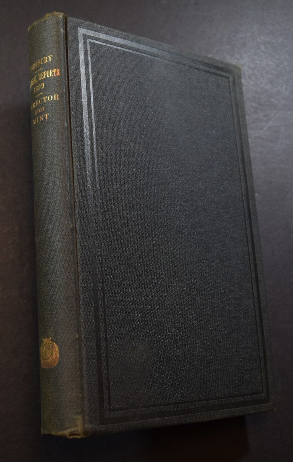 United States Treasury Department. ANNUAL REPORT OF THE DIRECTOR OF THE MINT TO THE SECRETARY OF THE TREASURY FOR THE FISCAL YEAR ENDED JUNE 30, 1899. Washington: Government Printing Office. 1899. 12mo. 470 pages. Original black blind-stamped cloth, gilt. Fine. Treasury Department, Document No. 2160. Tables. Index. The U.S. Mint Report consists primarily of the Mint Director's annual report to the Secretary of the Treasury, this series contains information often found nowhere else, revealing internal workings of the Mint and copious statistical data. In addition to the annual reports, this series includes other reports as issued, for example, results of assay tests of foreign gold and silver coins. Lot weight: 1 lbs 11oz. Subject(s): Mint Report - United States.