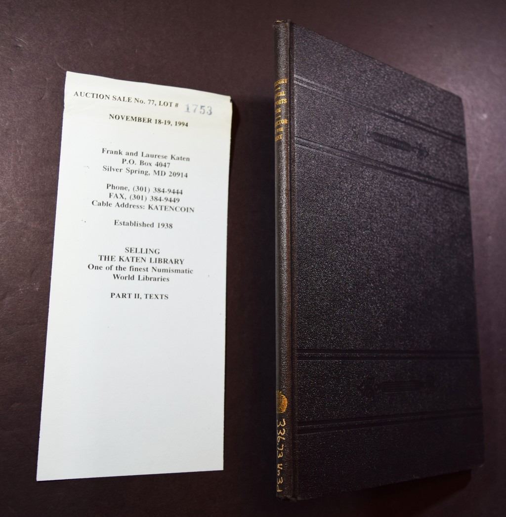United States Treasury Department. ANNUAL REPORT OF THE DIRECTOR OF THE MINT TO THE SECRETARY OF THE TREASURY FOR THE FISCAL YEAR ENDED JUNE 30, 1936 AND ALSO REPORT ON THE PRODUCTION OF PRECIOUS METALS IN THE CALENDAR YEAR 1935. Washington: Government Printing Office. 1936. 12mo. 117 pages. Original black blind-stamped cloth, gilt. Fine. 1 plate with the City of Providence, R.I. Tercentennial half dollar, Old Spanish Trail half dollar, and the California-Pacific half dollar. Treasury Department, Document No. 3080. Tables. Index. The U.S. Mint Report consists primarily of the Mint Director's annual report to the Secretary of the Treasury, this series contains information often found nowhere else, revealing internal workings of the Mint and copious statistical data. In addition to the annual reports, this series includes other reports as issued, for example, results of assay tests of foreign gold and silver coins. ex Frank and Laurese Katen Library. ex Katen Sale No. 77 Lot 1753. Lot weight: 0 lbs 9oz. Subject(s): Mint Report - United States.