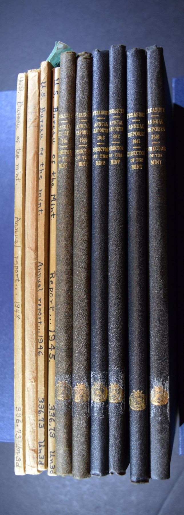 United States Treasury Department, 1940. ANNUAL REPORT OF THE DIRECTOR OF THE MINT TO THE SECRETARY OF THE TREASURY, 1940 TO 1949. Washington: Government Printing Office. This group lot contains the following books: