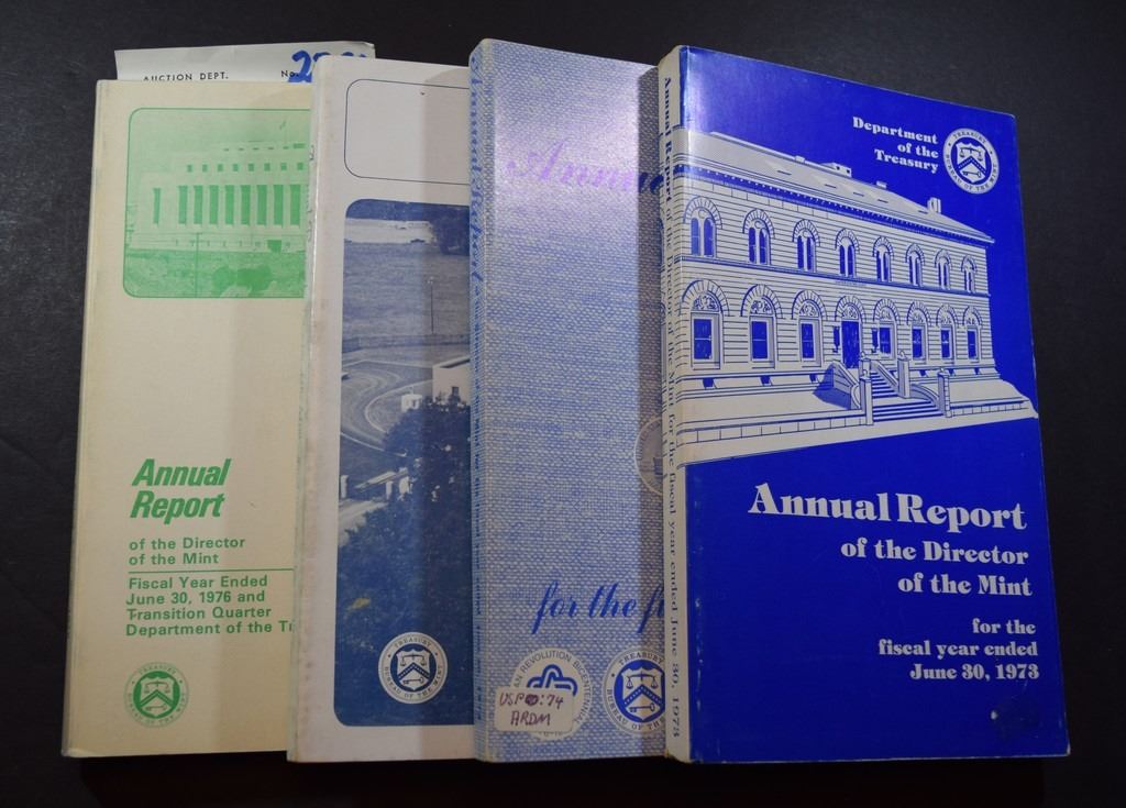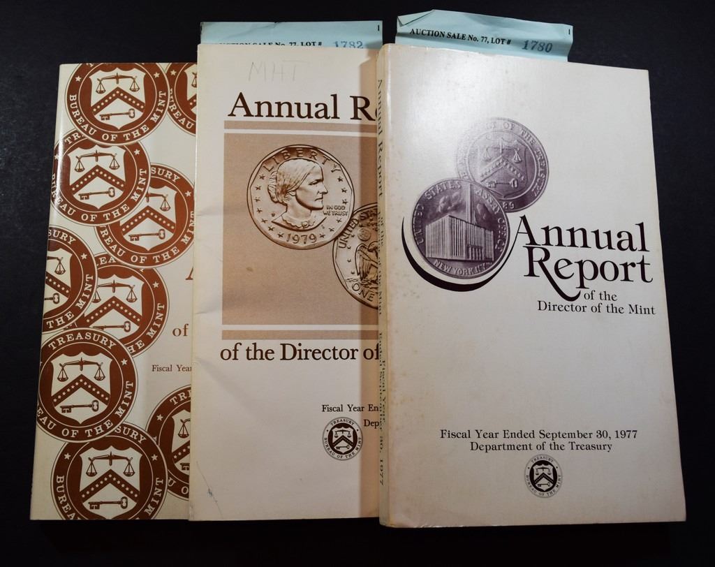 The U.S. Mint Report consists primarily of the Mint Director's annual report to the Secretary of the Treasury, this series contains information often found nowhere else, revealing internal workings of the Mint and copious statistical data. In addition to the annual reports, this series includes other reports as issued, for example, results of assay tests of foreign gold and silver coins. Lot weight: 5 lbs 13oz. Subject(s): Mint Report - United States.
