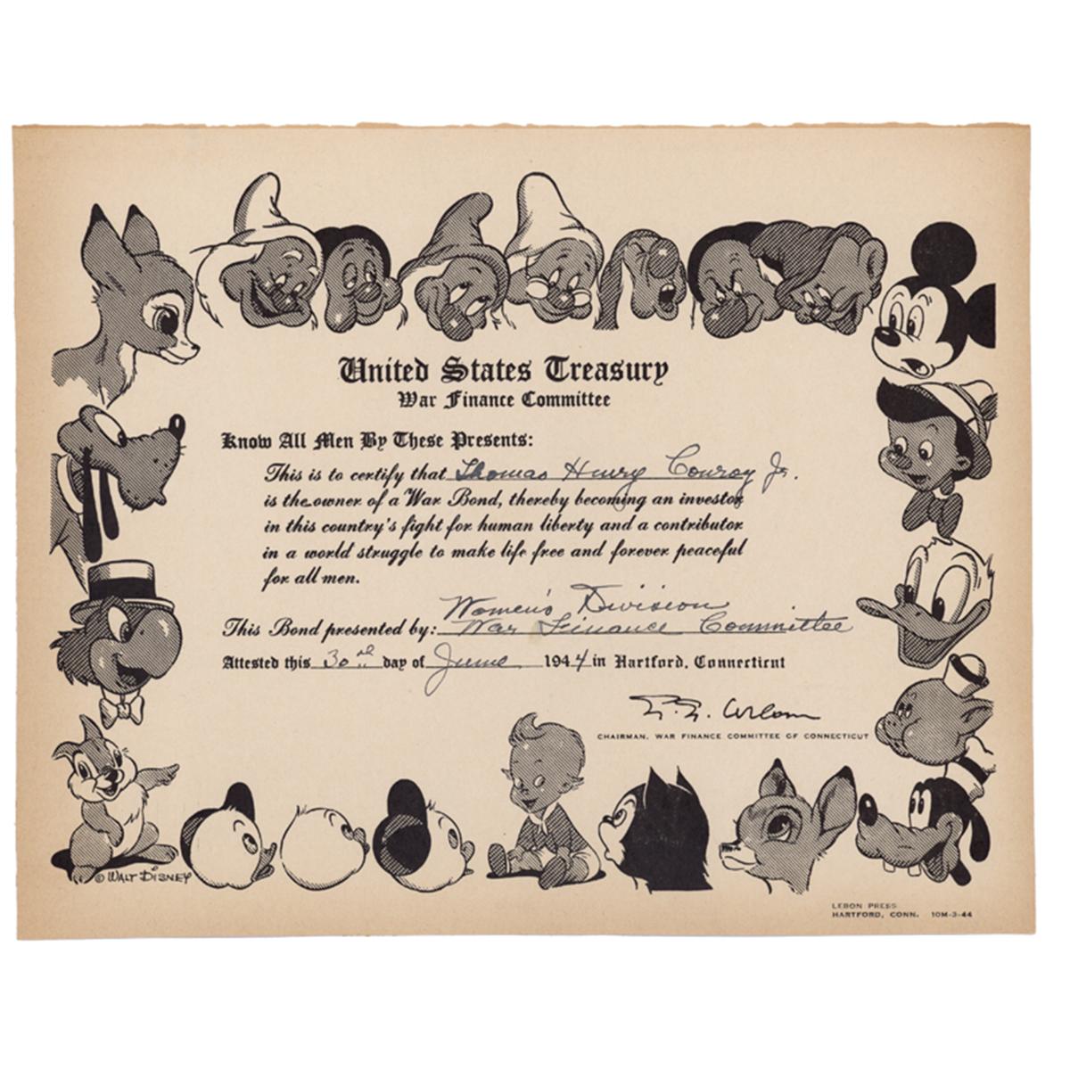 1944, Hartford, Connecticut. Black and White. Disney characters surrounding all for sides of the certificate. Printed signature of Walt Disney at lower left corner next to the copyright. These were issued as premiums to purchasers of U.S. WWII savings bonds. A rare variety. Uncancelled and Very Fine.