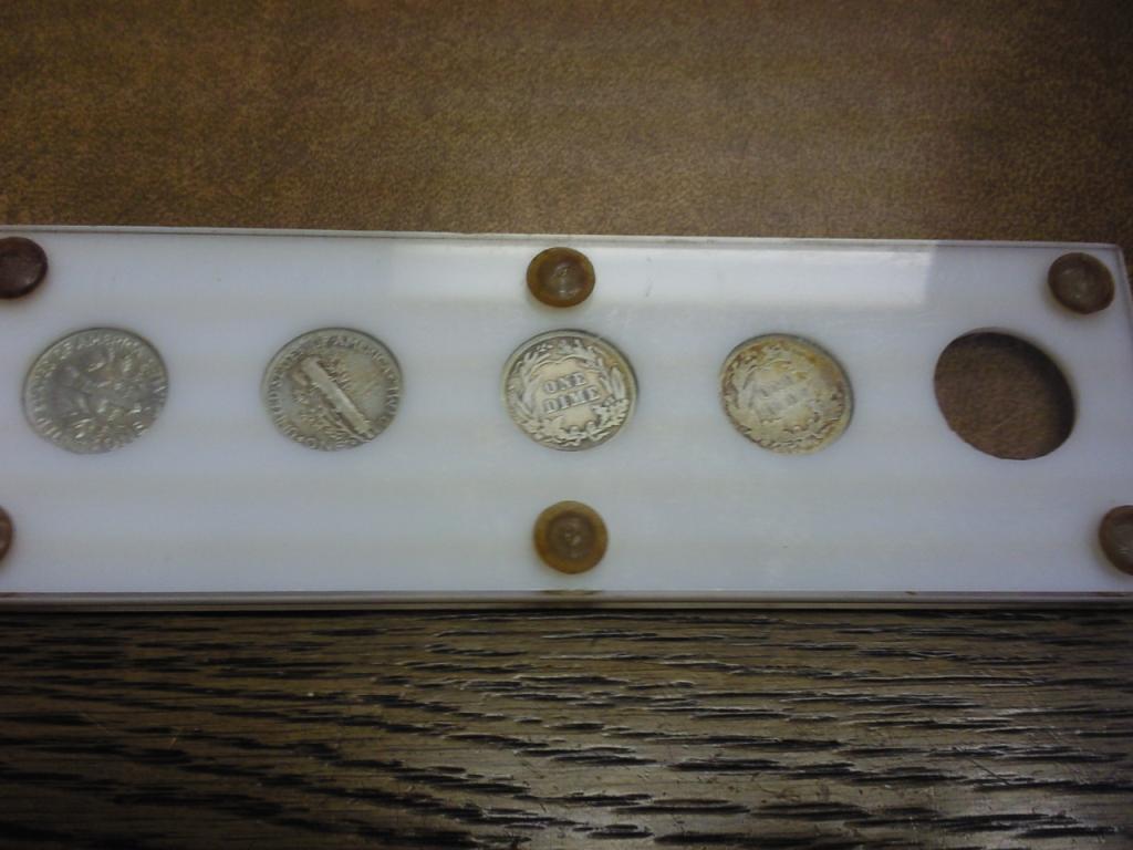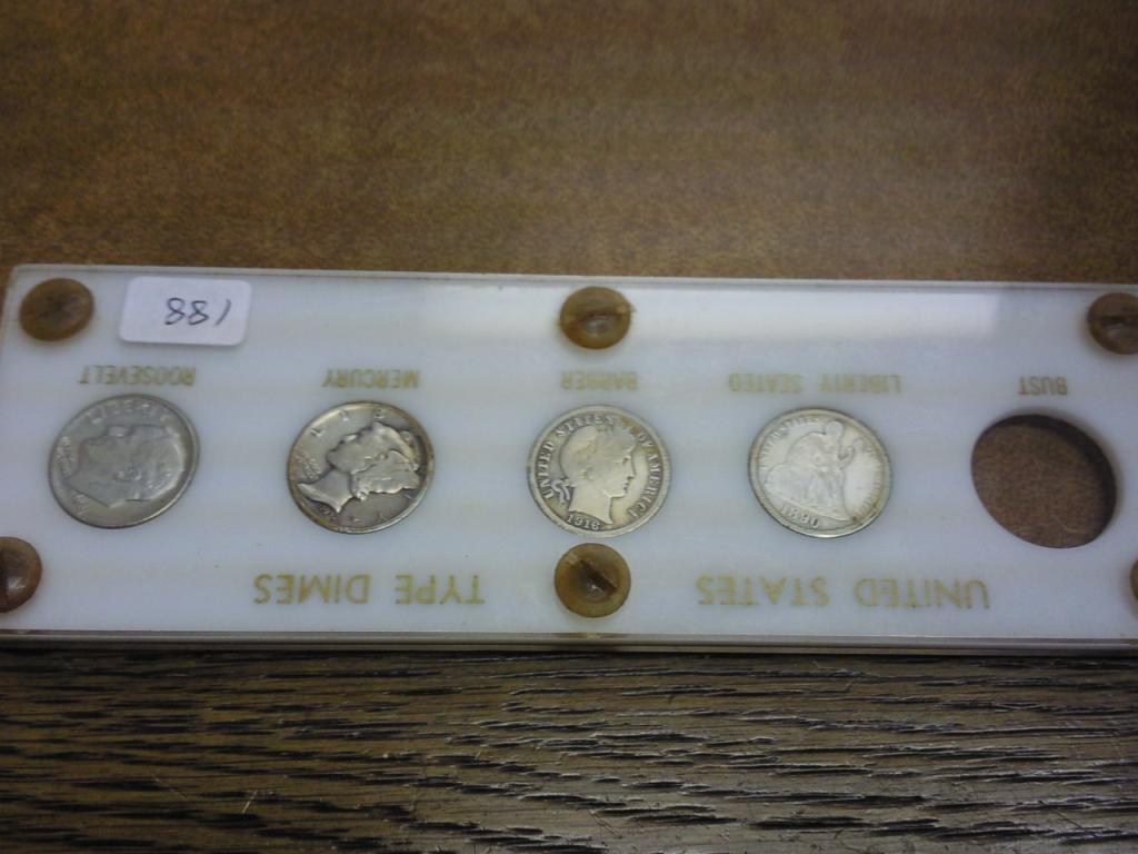 Contains: 1890 Seated Dime (Fine +), 1916 Barber Dime (VG), 1935-D Mercury Dime And 1961-D Roosevelt Silver Dime In Plastic Holder