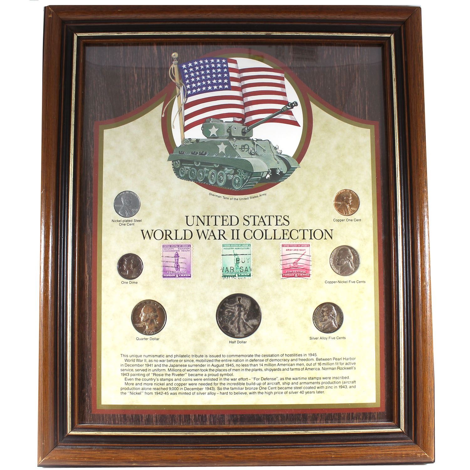*United States World War II Collection in Wooden Frame. You will receive nickel-plated 1-cent, copper 1-cent, copper-nickel 5-cent, silver alloy 5-cent, silver dime, silver quarter dollar & silver half dollar with 3 stamps.
