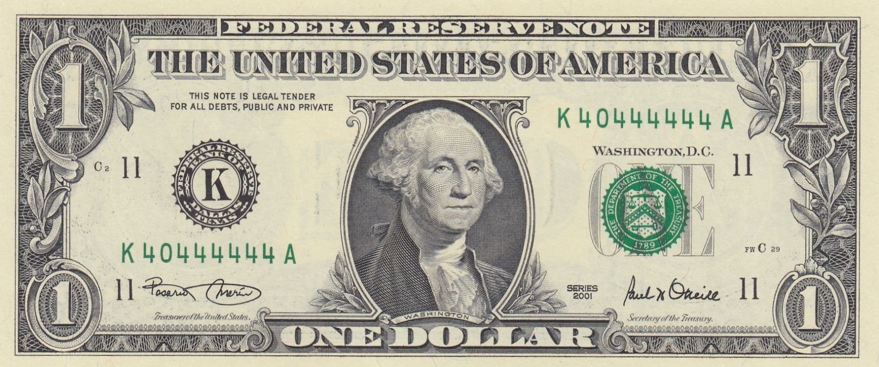 United States of America, 1 Dollar, 2001, UNC, p509, 6 DIGIT RADARbr/serial number: K 40444444 A