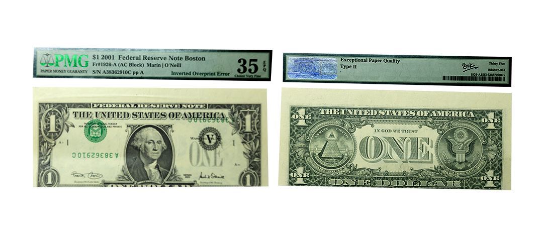 United States of America, One Dollar, Misprint, Inverted Overprint error, Federal Reserve Note Boston, Serial: A38362910C, Signed Marin O' Neill, Graded by PMG Choice Very Fine 35, Exceptional Paper Quality, Very Rare.