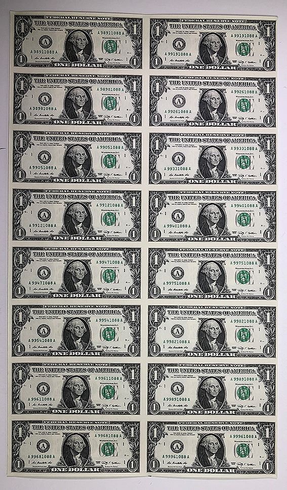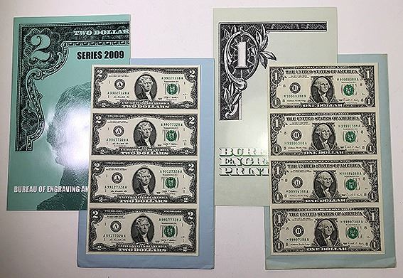 USA, Federal Reserve One Dollar, 1988 uncut run of four, Two Dollars, 2009, uncut run of four; together with One Dollar, 2009 uncut sheet of Sixteen notes, uncirculated (3 items, F/V = $28 USD)
