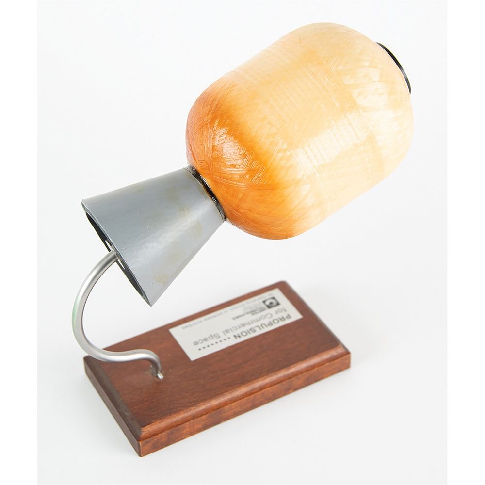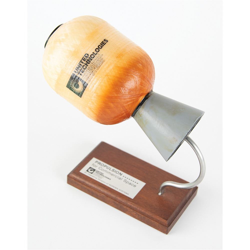 Appealing United Technologies contractor model of a spacecraft, measuring approximately 7.5Ë long and 3.5Ë in diameter, marked on the side with the company's logo: "United Technologies Chemical Systems." The model stands on a wooden base featuring an affixed United Technologies plaque: "Propulsion—for Commercial Space.". In fine condition, with some irregular toning to the model.
