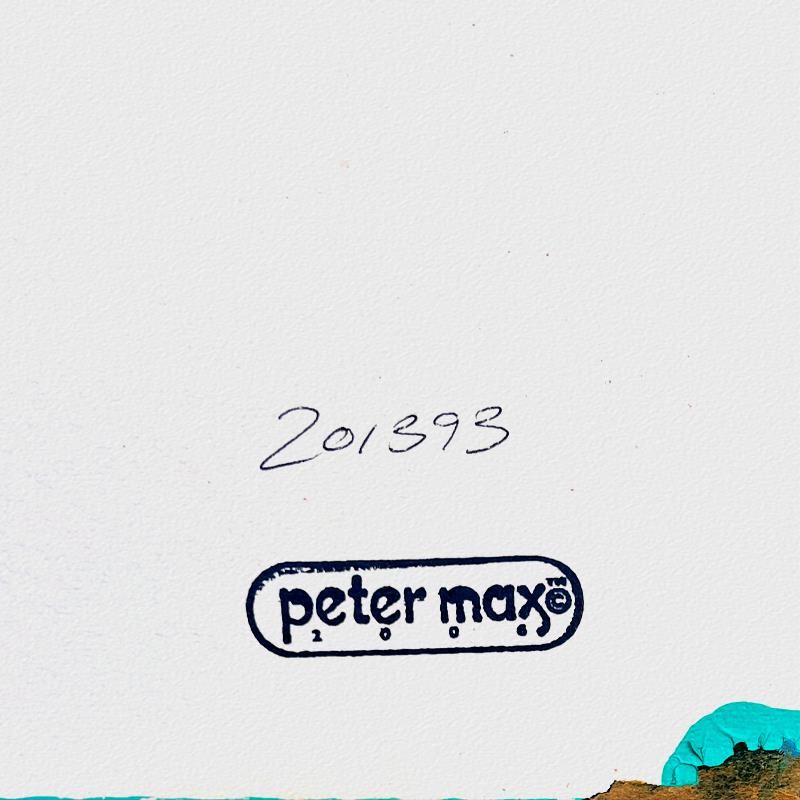 "United We Stand" is a one-of-a-kind mixed media on paper, hand signed by Peter Max. The piece comes custom framed with a backside cutout to display Peter Max Studio registration number 201393 certifying authenticity. Measures approximately 35" x 29" (frame), 24" x 18" (image).