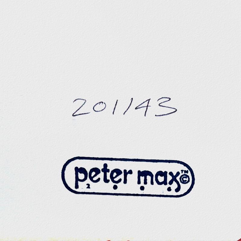 "United We Stand" is a one-of-a-kind mixed media on paper, hand signed by Peter Max. The piece comes custom framed with a backside cutout to display Peter Max Studio registration number 201143 certifying authenticity. Measures approximately 30" x 24" (frame), 24" x 18" (image). This item requires special handling and may have a longer than usual turnaround.