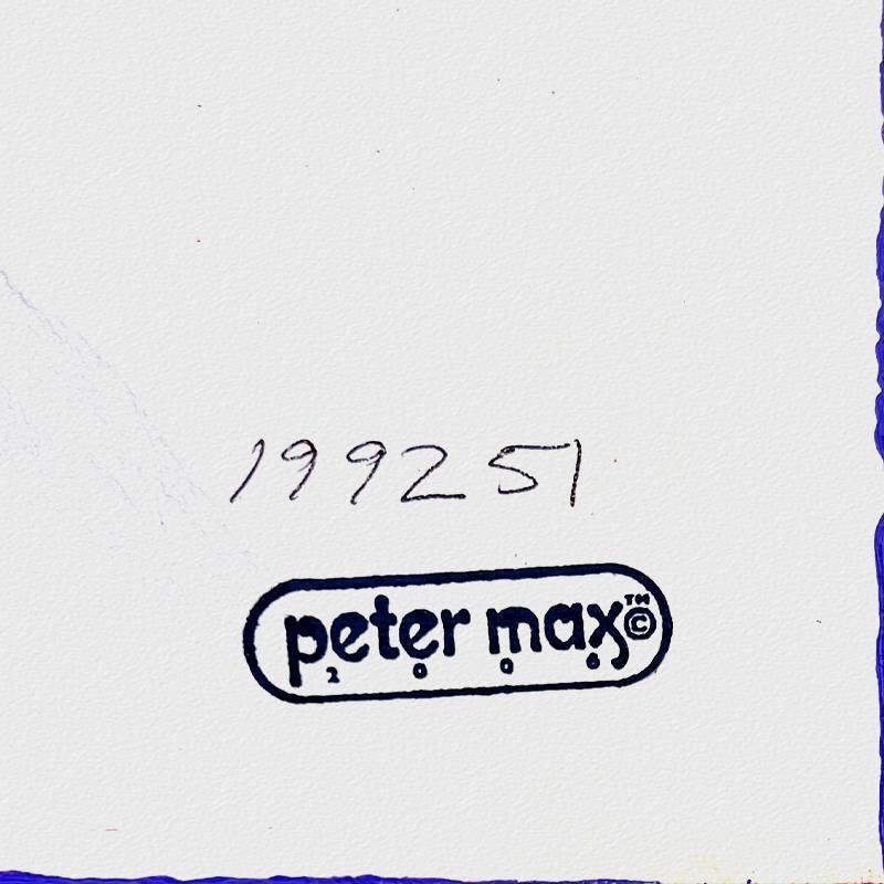 "United We Stand" is a one-of-a-kind mixed media on paper, hand signed by Peter Max. The piece comes custom framed with a backside cutout to display Peter Max Studio registration number 199251 certifying authenticity. Measures approximately 35" x 29" (frame), 24" x 18" (image). This item requires special handling and may have a longer than usual turnaround.