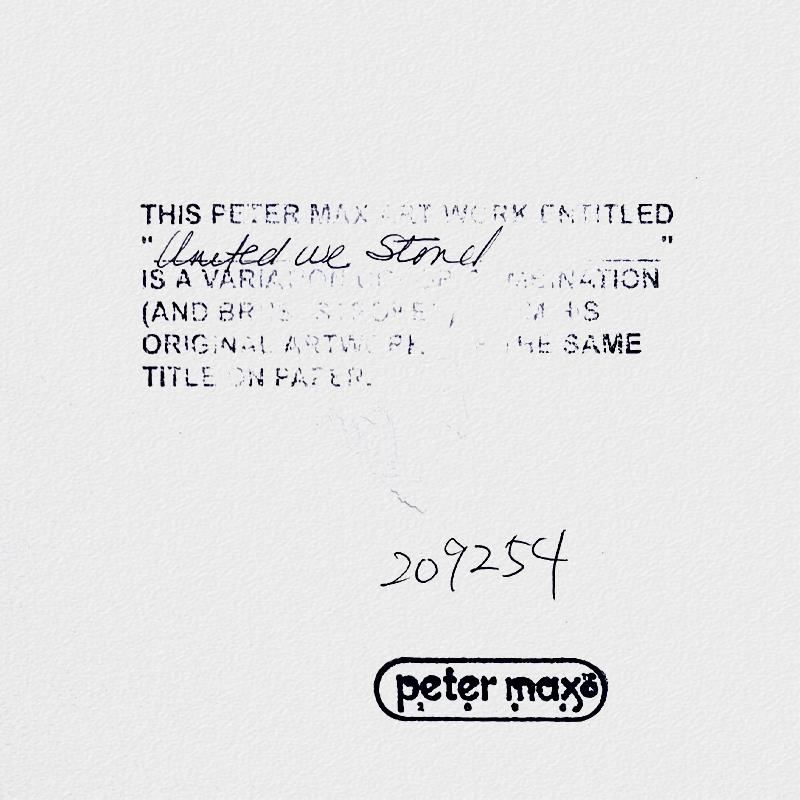 "United We Stand" is a one-of-a-kind mixed media on paper, hand signed by Peter Max. The piece comes custom framed with a backside cutout to display Peter Max Studio registration number 209254 certifying authenticity. Measures approximately 28" x 24" (frame), 19" x 15" (image). This item requires special handling and may have a longer than usual turnaround.