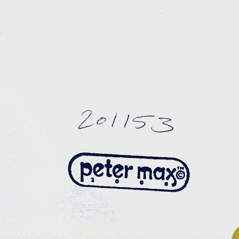 "United We Stand" is a one-of-a-kind mixed media on paper, hand signed by Peter Max. The piece comes custom framed with a backside cutout to display Peter Max Studio registration number 201153 certifying authenticity. Measures approximately 35" x 29" (frame), 24" x 18" (image). This item requires special handling and may have a longer than usual turnaround.