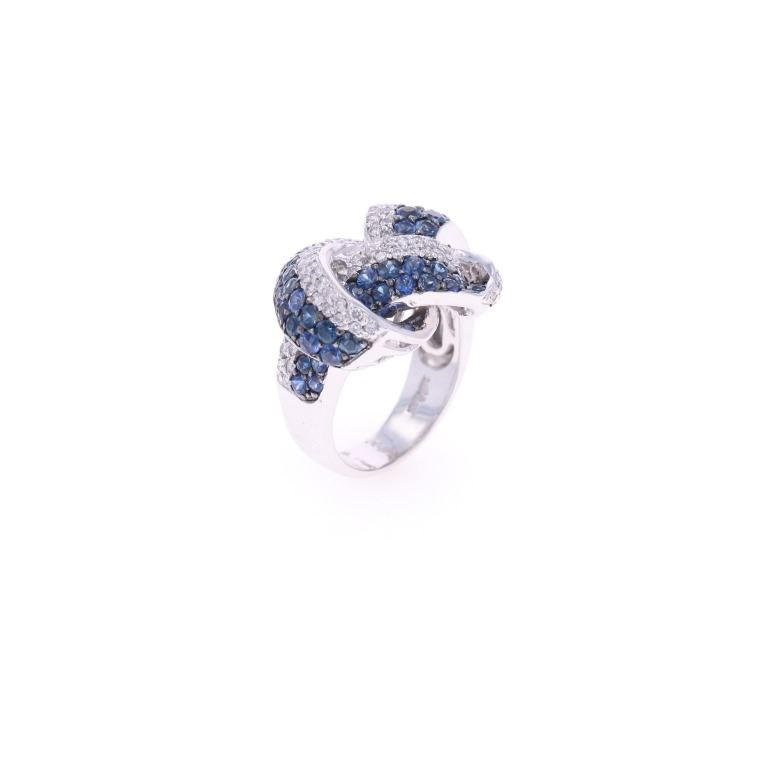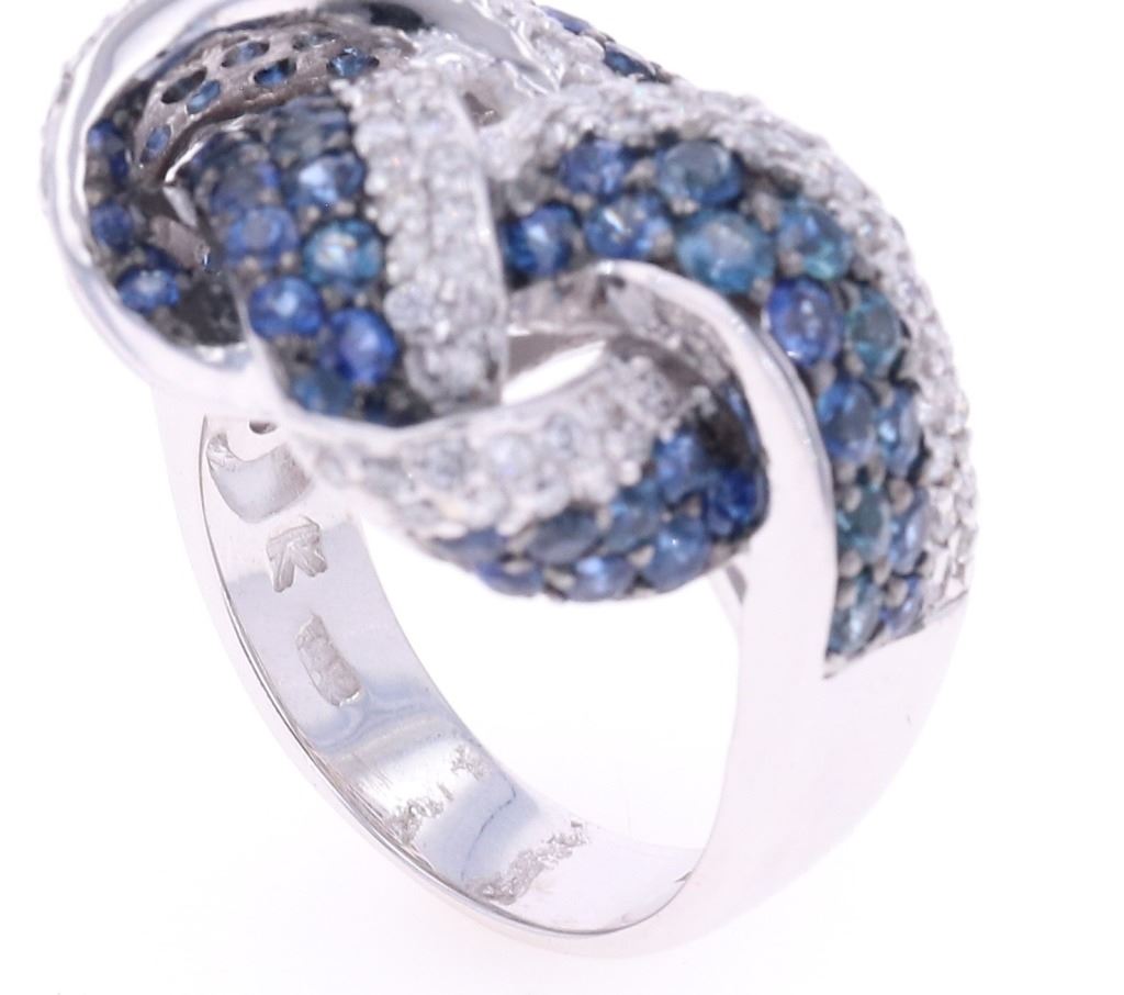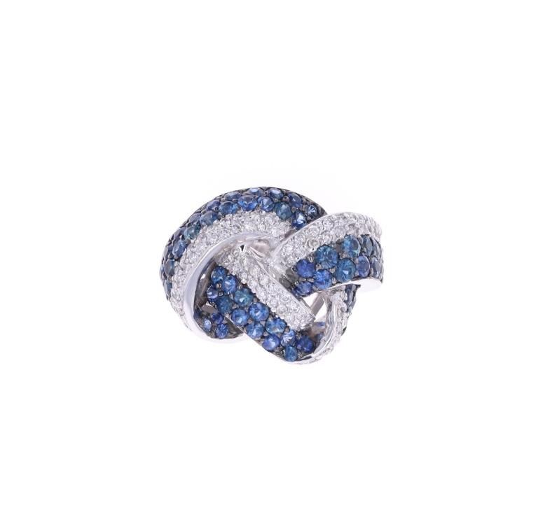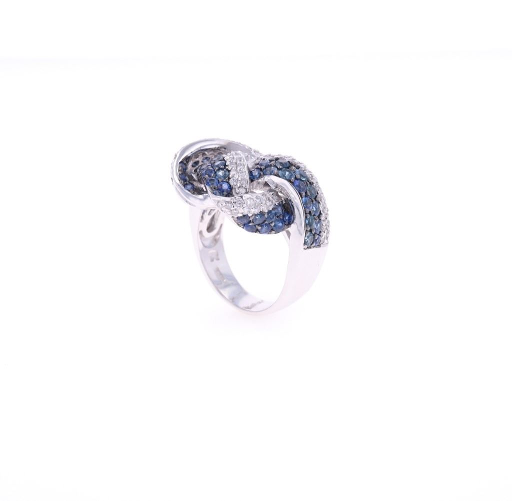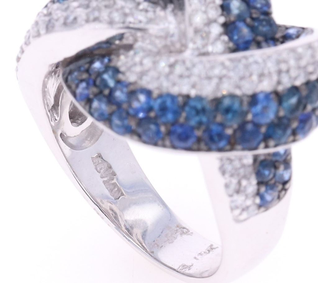 Featured in this lot is this knotted sapphire VS2 diamond and 14k white gold ring with GGA paperwork. The ring features a polished, stamped, and tested 14k white gold construction and is marked with a hallmark and '14k' on the inside of the ring band. The ring features a knotted design to the ring face from a single thick ring band and is profusely decorated with a total of 63 natural round brilliant sapphires with measurements of 2.7 x 1.9mm and shows a type 3 clarity with a 5/5 blue coloration and an estimate weight of 4.00ct. The unity knot design is also decorated with a total of 85 round brilliant cut diamonds that shows measurements of 1.6 x 1.3mm and shows clarity of VS1 - VS2 with a color grade of G - H and a total diamond weight of estimate 1.00ct. The piece comes complete with GGA(GemAssure Gemological Appraisals, GGA Appraisal Number#: GGA073811 and trace number: RN038645) report and appraisal confirming the above info and giving a total value of $19,270.00. The ring size is US 8.