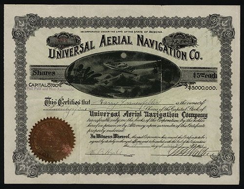 Arizona, 1911, 25 Shares, Issued Stock, black on black border and underprint, Vignette of flying vessels with mountains in background, VF-XF condition.