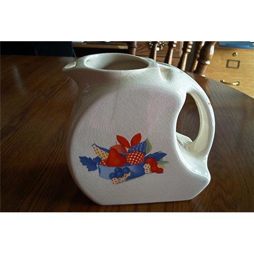 Pottery pitcher made by Universal-Cambride, Ohio. Decorated with colorful fruits, leaves, and blue bowl. Handle decorated in red. Measures 6 3/4 inches tall; opening diameter measures 2 3/4 inches; depth measures 6 inches bottom base diameter measures 4 1/2 inches long by 4 1/4 inches; Bottom stamped in Gold Lettering: UNIVERSAL-CAMBRIDGE, OHIO-OVEN PROOF-MADE IN USA. One hairline crack is seen near the top. Otherwise in excellent condition.