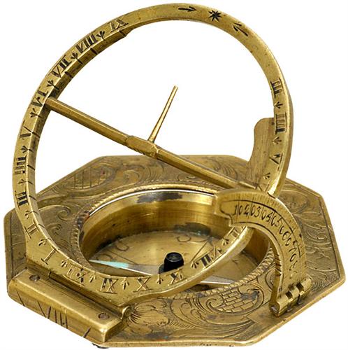 Universal Equatorial Pocket Sundial, c. 1850 Signed "Lorenz Graßl", Augsburg, octagonal dial with engraved flower and scroll decoration, base engraved with latitudes for European cities, Ø 2 in., needle replaced, without glass.<Br>