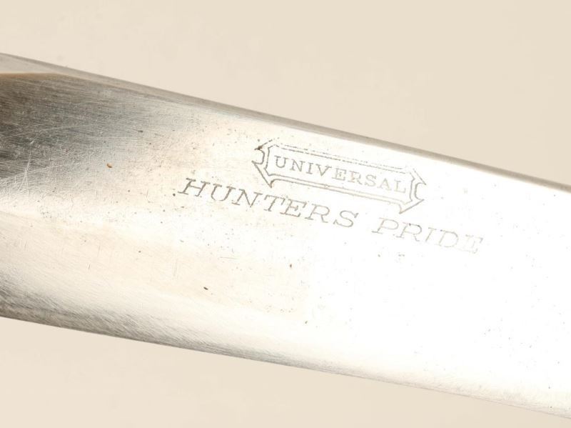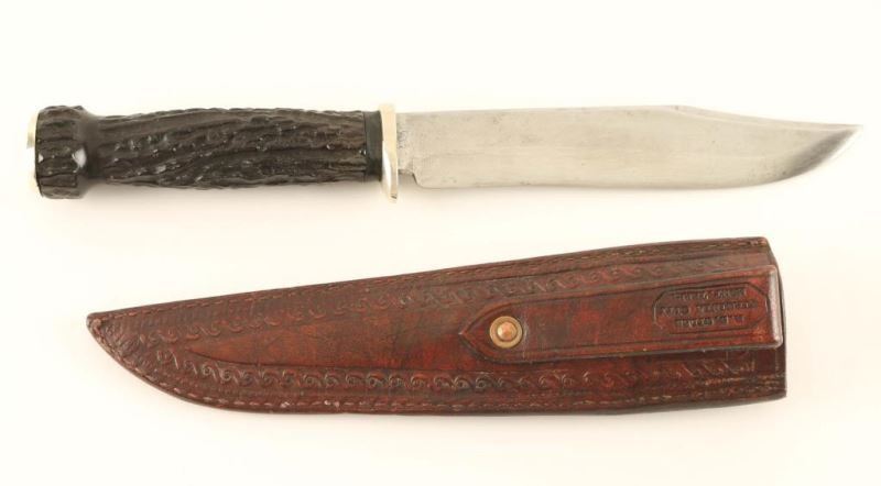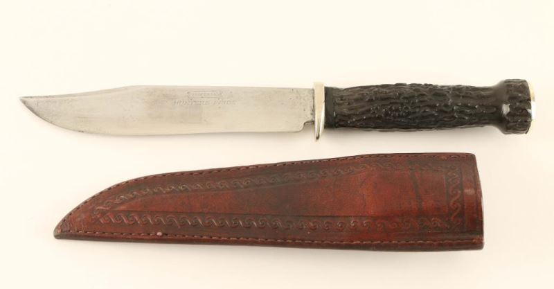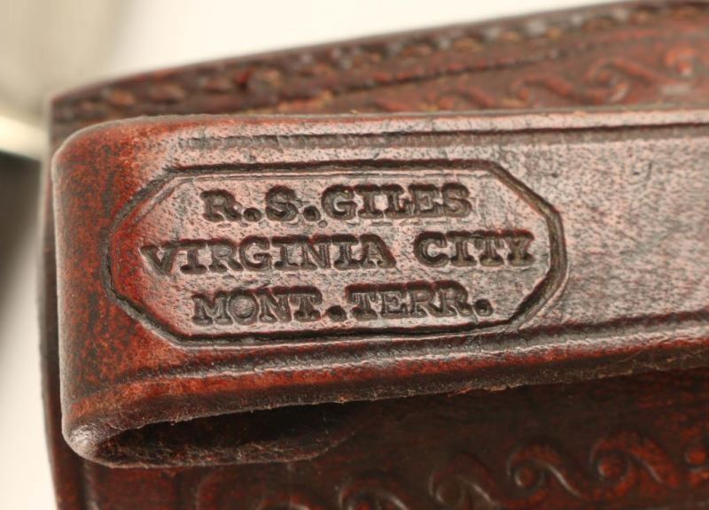 Dark horn and stag grip. German silver mounts. 10 3/8" overall with a 6" clip point blade. Near fine condition. Includes custom scabbard marked "Giles", Montana made expertly and with attention to authenticity.