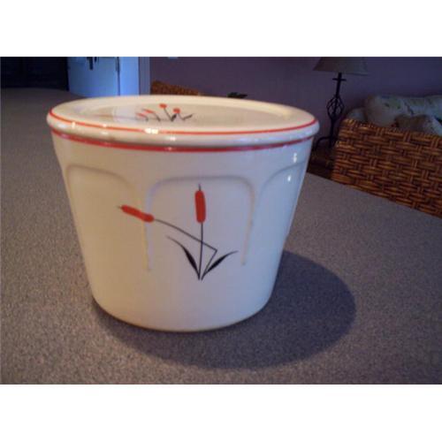 <table width="100%" border="0" cellspacing="0" cellpadding="4"><tr><td><em> </em></td></tr><tr> <td width="100%"> This is a grease or drippings jar made by Universal Potteries probably in the late 40's. It is done in their cattail design. No chips or cracks are noted. The colors are bright and have few scratches. There is some light crazing and discoloration around the lid to the jar. It is 4.5" tall and has a 6" diameter. I have never seen one of these in such good condition. This would be a welcome addition to any kitchen collection. </td></tr><tr> <td> </td></tr><tr> <td>Reference #: C18</td></tr><tr><td>Condition:Very good</td></tr><tr><td>Year:circa 1948</td></tr><tr><td>Title:Universal Potteries Cattail Grease Jar</td></tr><tr><td>Location:Montgomery, Alabama</td></tr></table>