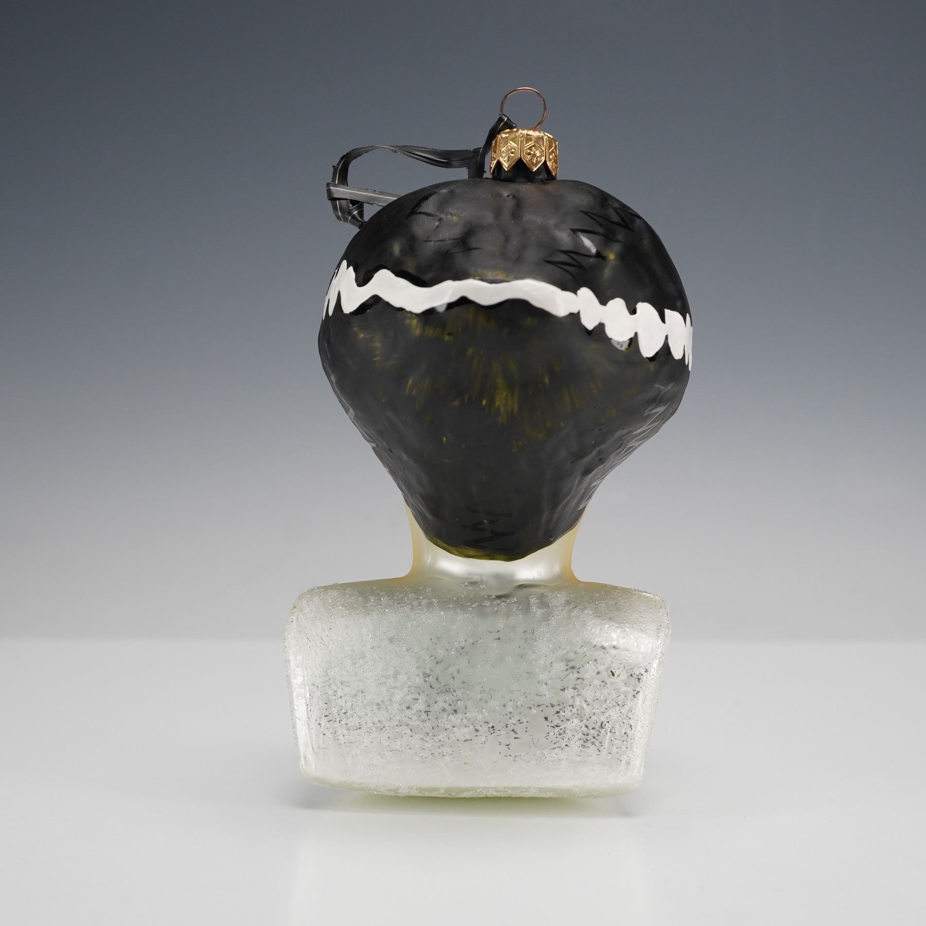 Hand painted glass Halloween ornament modeled as the bust of the Bride of Frankenstein with black hair and white streaks and red eyes, finished in metallic tones and gold tone cap, designed by Christopher Radko in 1997 and made in Poland, housed in the original black Universal Studios Monsters box.