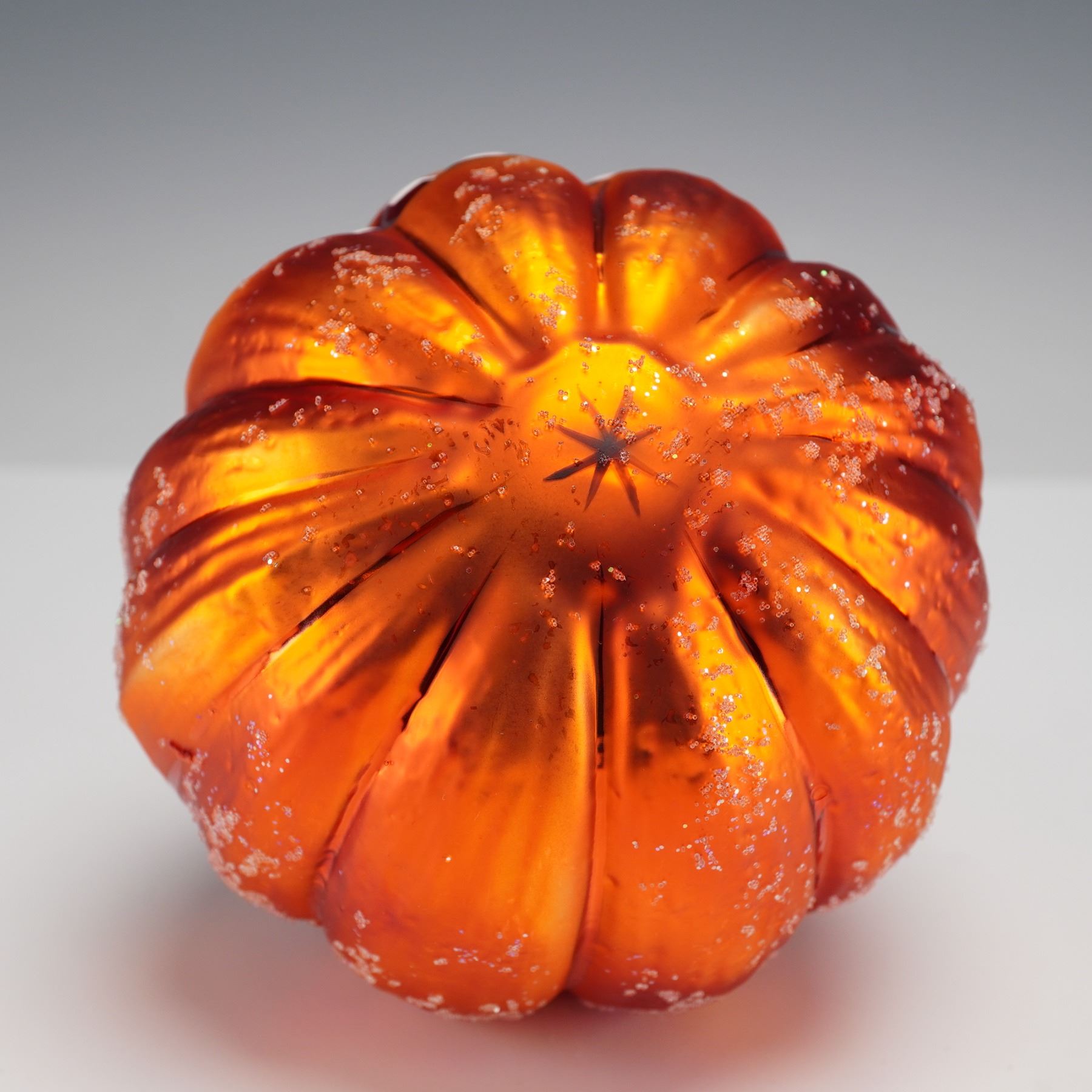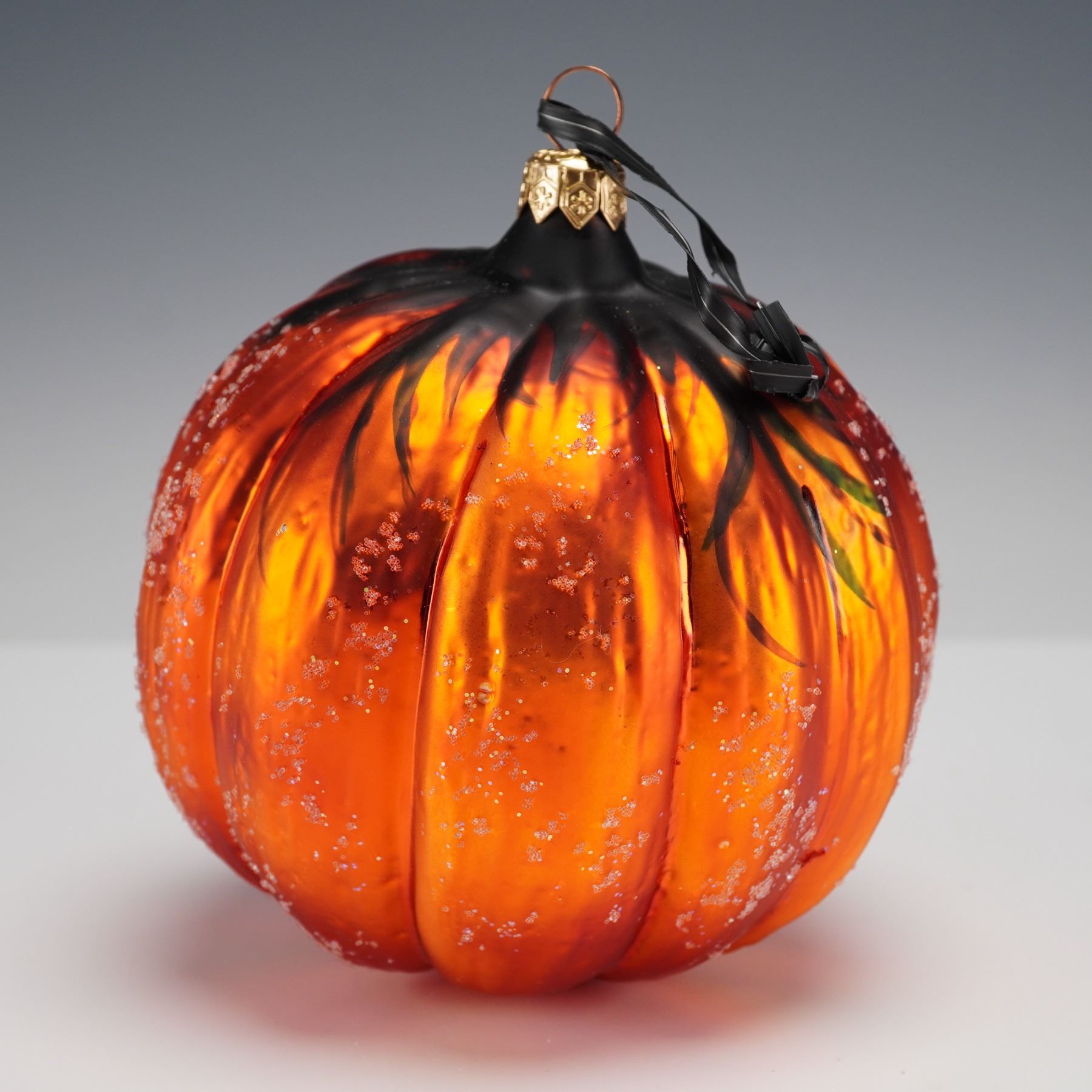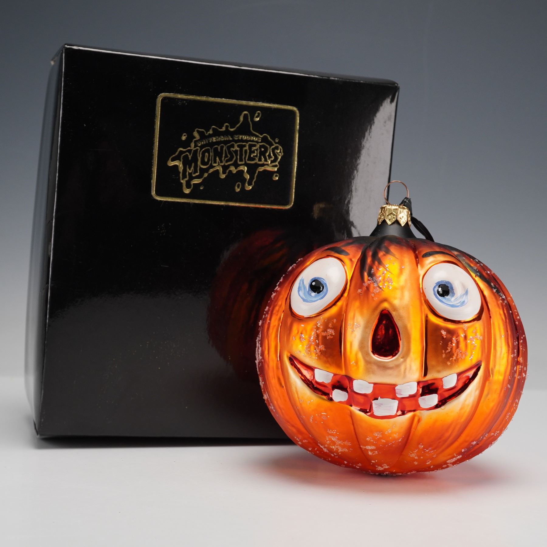 Hand painted glass Halloween ornament depicting a wide eyed jack o lantern with toothy grin and red nose, finished in bright metallic orange and gold tone cap, housed in a black Universal Studios Monsters box.