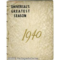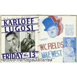 <B>Universal Trade Publication (Universal, 1940)</B></I> Multiple Pages. This beautiful book produced for the Australian exhibitors of Universal pictures is done in full color on a gorgeous linen finish paper. Advertised inside on full page spreads are such films as Bela Lugosi and Boris Karloff in "Friday the 13th (Black Friday)" and W.C. Fields and Mae West in an untitled production (My Little Chickadee). Everything from their serials to the short subjects are advertised here. An amazingly attractive presentation put together for this english speaking overseas market. Very Fine+.