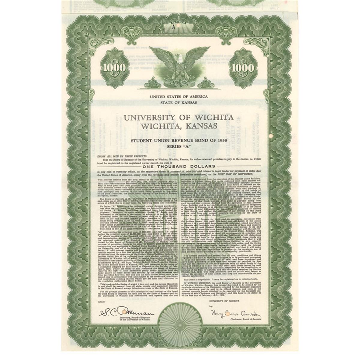 [SPECIMEN] ----, Kansas. $1000 Student union revenue bond of 1958 specimen. Green / Black. Vignette of an eagle at top center. Green underprint. Coupons attached. Punch cancellation at signatures. Stamp and punch cancellation through coupons. Very Fine.