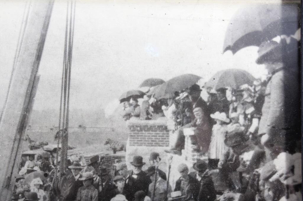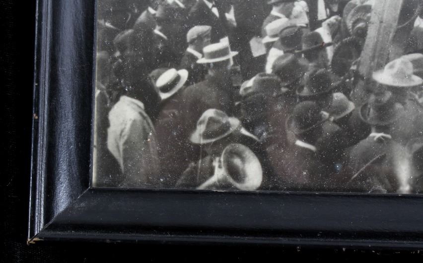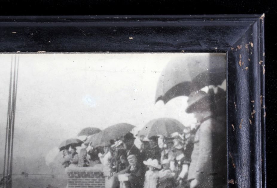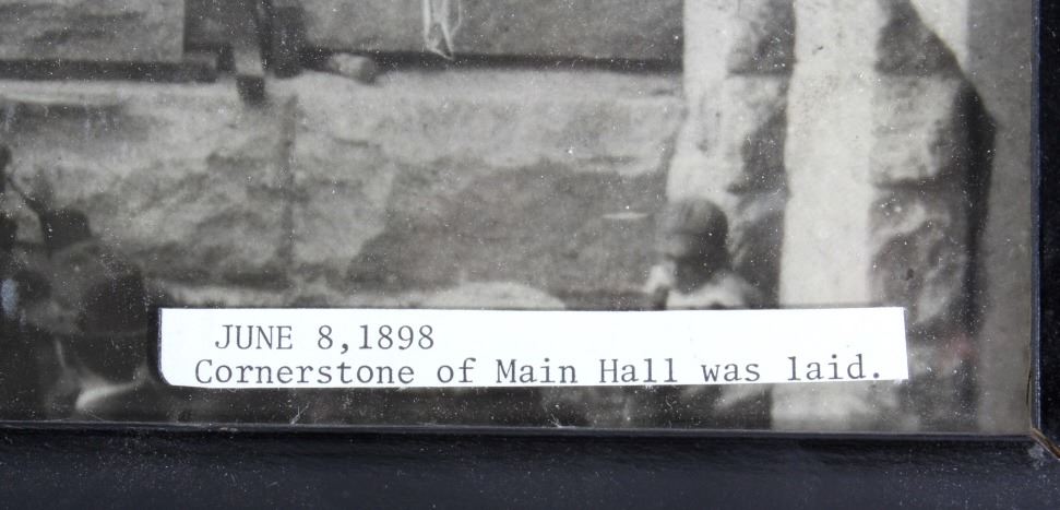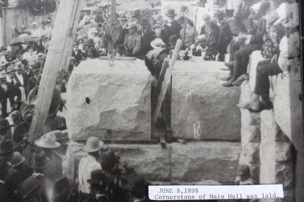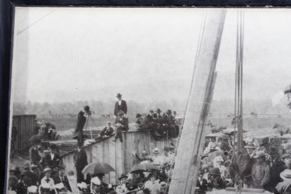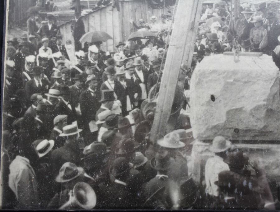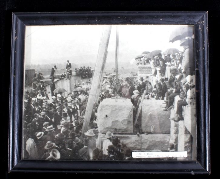 Offered in this lot we have a photograph of the placement of the cornerstone for the main hall of the University of Montana in 1898. The photo shows a crowd of onlookers watching the cornerstone for the main hall of the University of Montana being laid in Missoula, Montana. The image features a note reading "June 8, 1898 - Cornerstone of Main Hall was Laid" across the front. The photo is set in a black wood frame. The piece shows good condition overall with some signs of wear on the frame. The frame measures 11 1/4" wide by 9 1/4" tall.