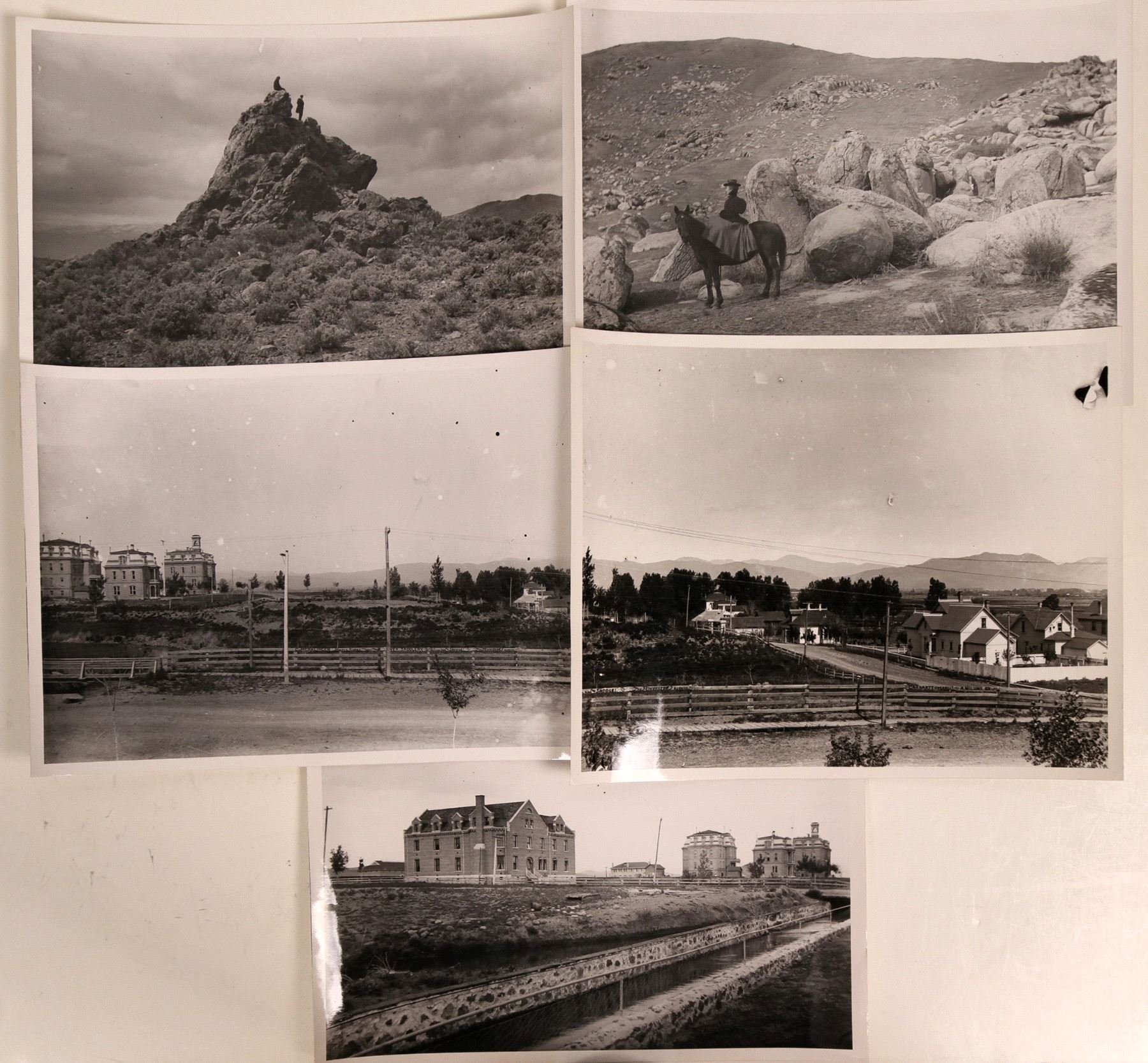 Five 8 x 10 B&W Photographs of Reno, Nevada. Three form a panorama on the University of Nevada Reno campus and adjoining residential community from the west. Written on fence in foreground of two of UNR photographs reads: C. MEAKLINCER WHIPS & ROBES NEAR PERRY'S STABLE _YER SADDLERY ~ 21 COM. ROW FOR THE RIVERSIDE W.J. GOSSIE CARHART T OVERALLS AT A. NELSONS. Also, two landscape images with people (Geiger Grade?). Circa 1890-1900. Contact prints from glass plate negatives. Sharp and clear.