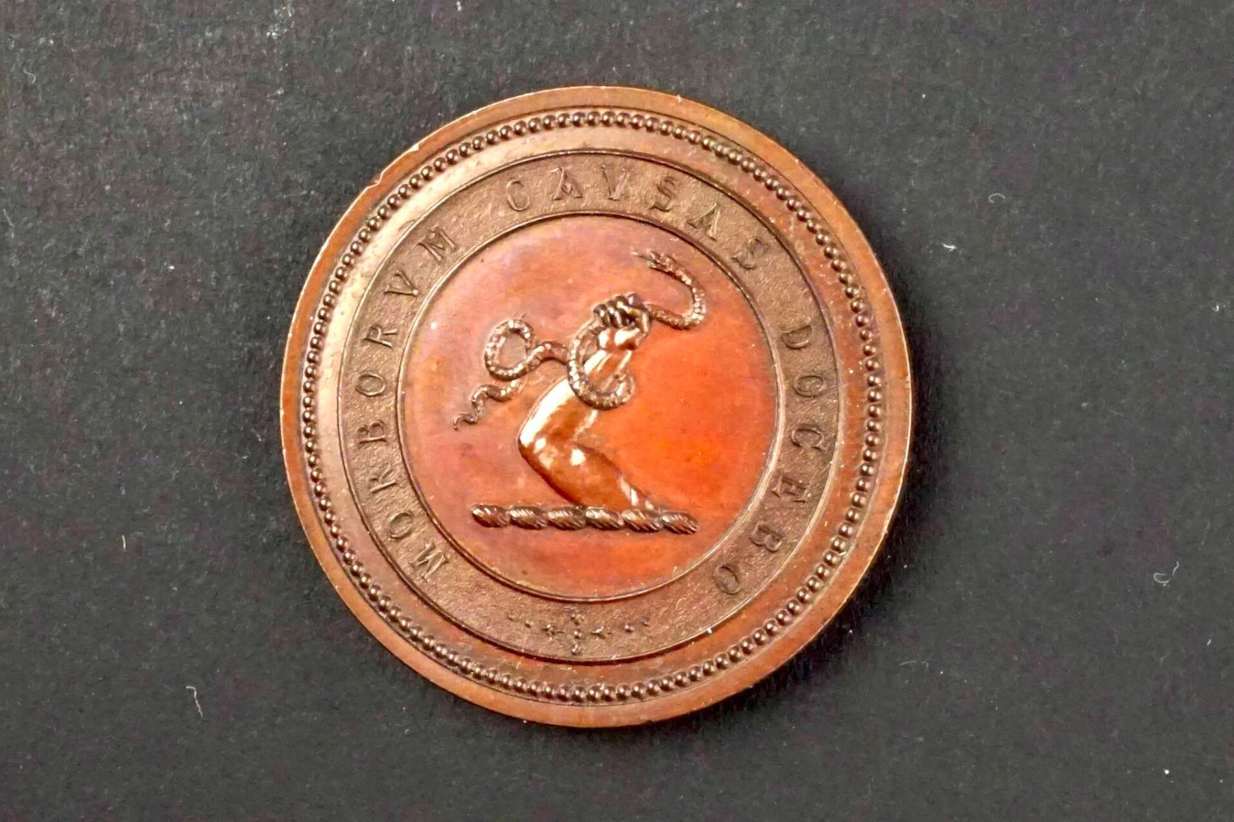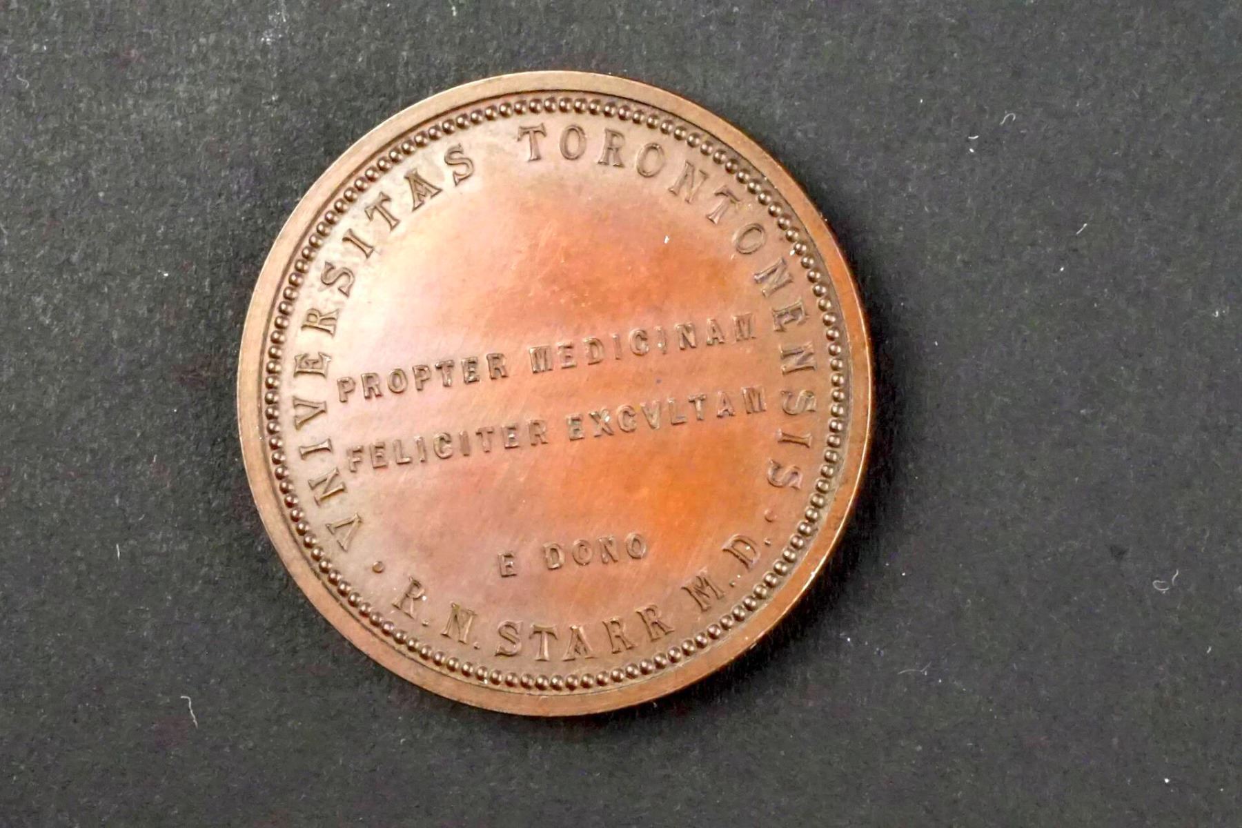 Copper 34 mm. 21.7 grams. Obverse: in a banner around an inner circle: MORBORVM CAVSVS DOCEBO. In the center from a ground line, a bent arm, a snake in hand. Reverse: UNIVERSITAS TORONTONENSIS. in center: PROPTER MEDICANUM / FELICITER EXCULTAM / E DONO and below: R. N. STARR M. D. Condition is a Choice Glossy UNC.