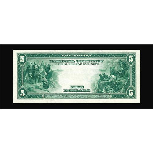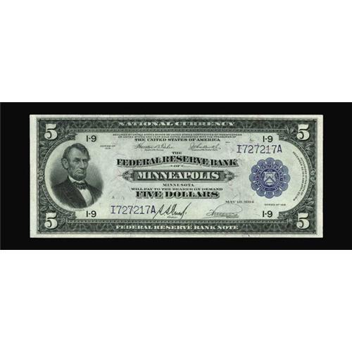 <B>Fr. 799 $5 1918 Federal Reserve Bank Note Gem New.</B></I> This newly discovered Minneapolis $5 is well preserved and rich in margins. It is also the nicest we can recall for this Friedberg number. In fact the census now has approximately 60 serial numbers in it and only one note is graded as nice as this note.<BR><I>From The Plymouth Rock Collection</B></I>