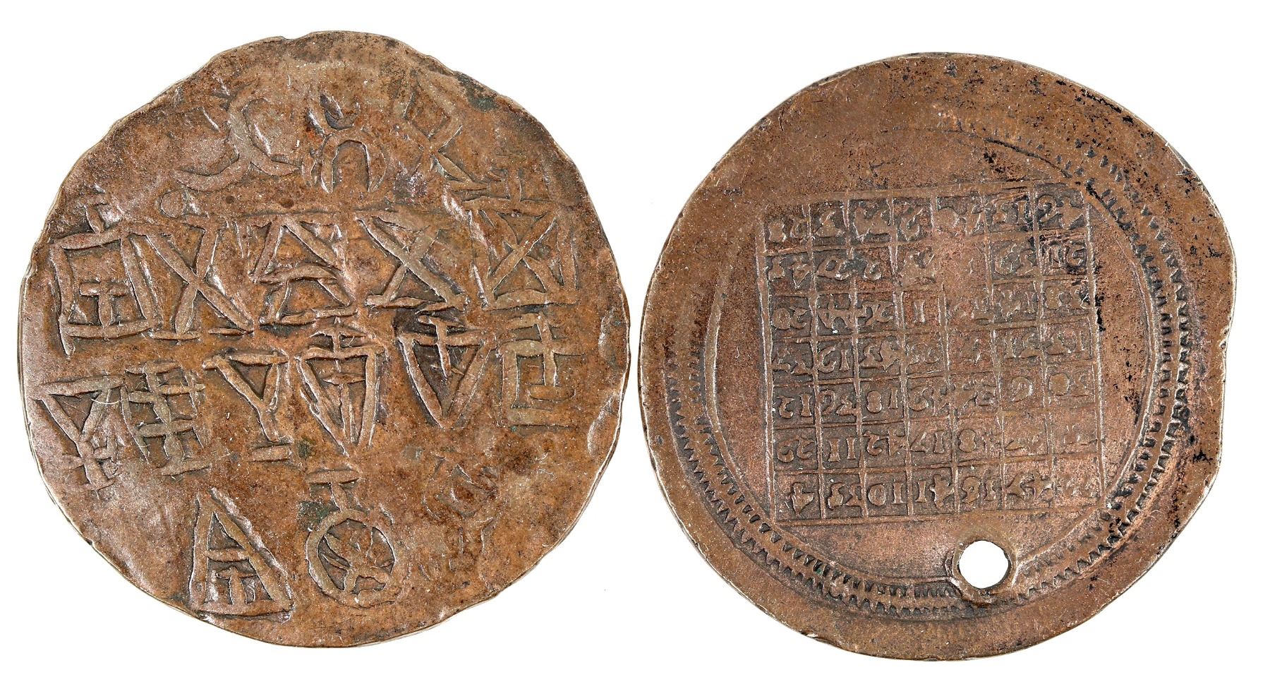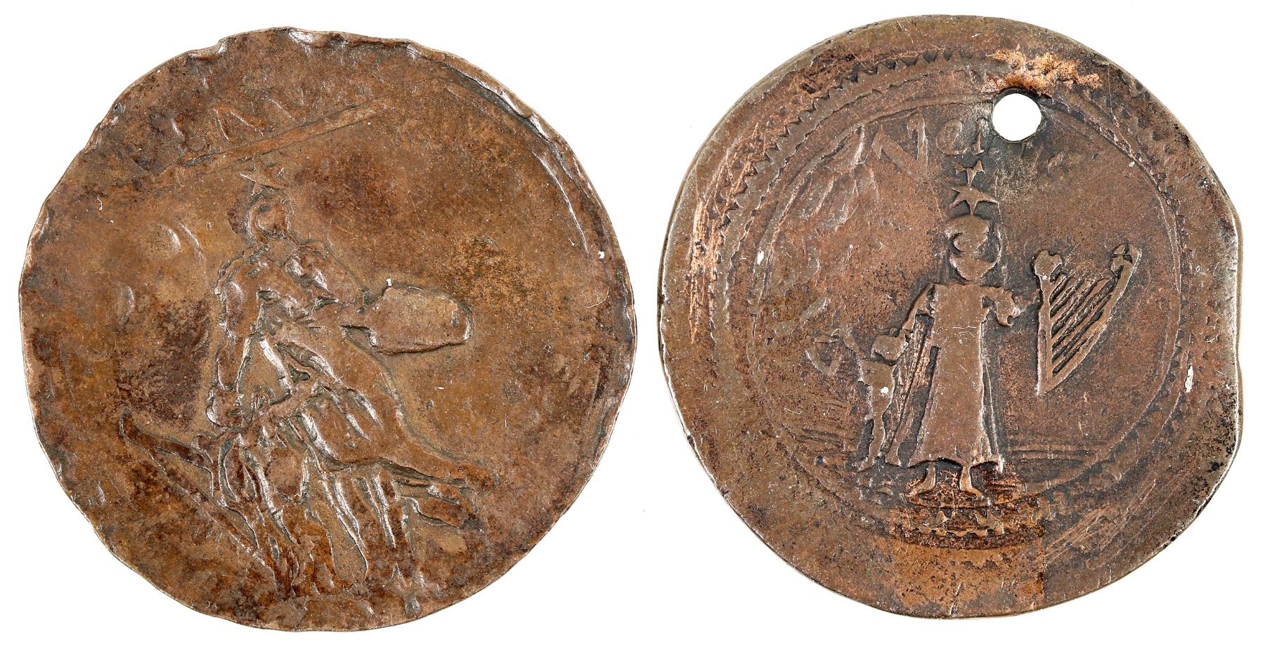 Highly unusual, two unknown ancient coppers. Google AI cannot identify them, thus they must be rare. Unverified language, mythical scene. Star over soldier's head. One is holed, 30 mm; the other is 31 mm. Might come from extra terrestrials.