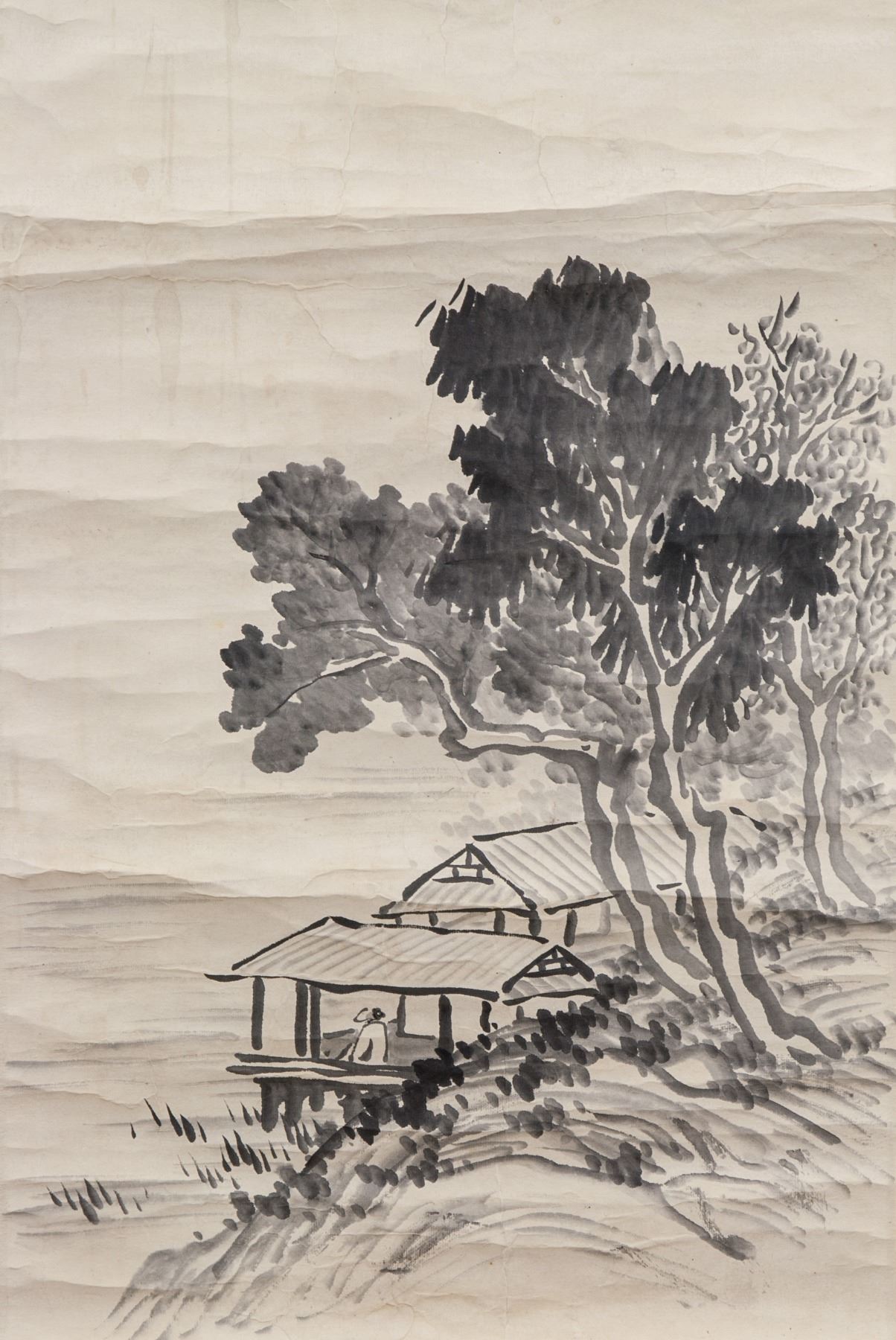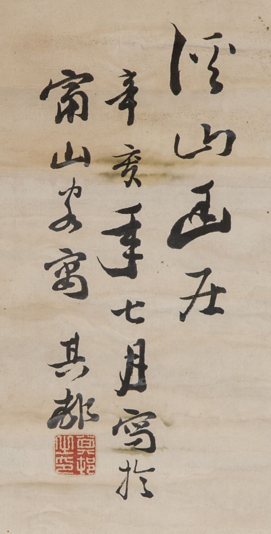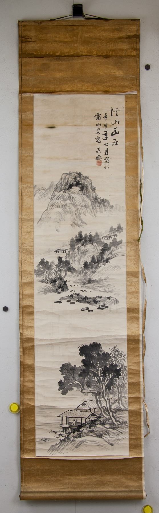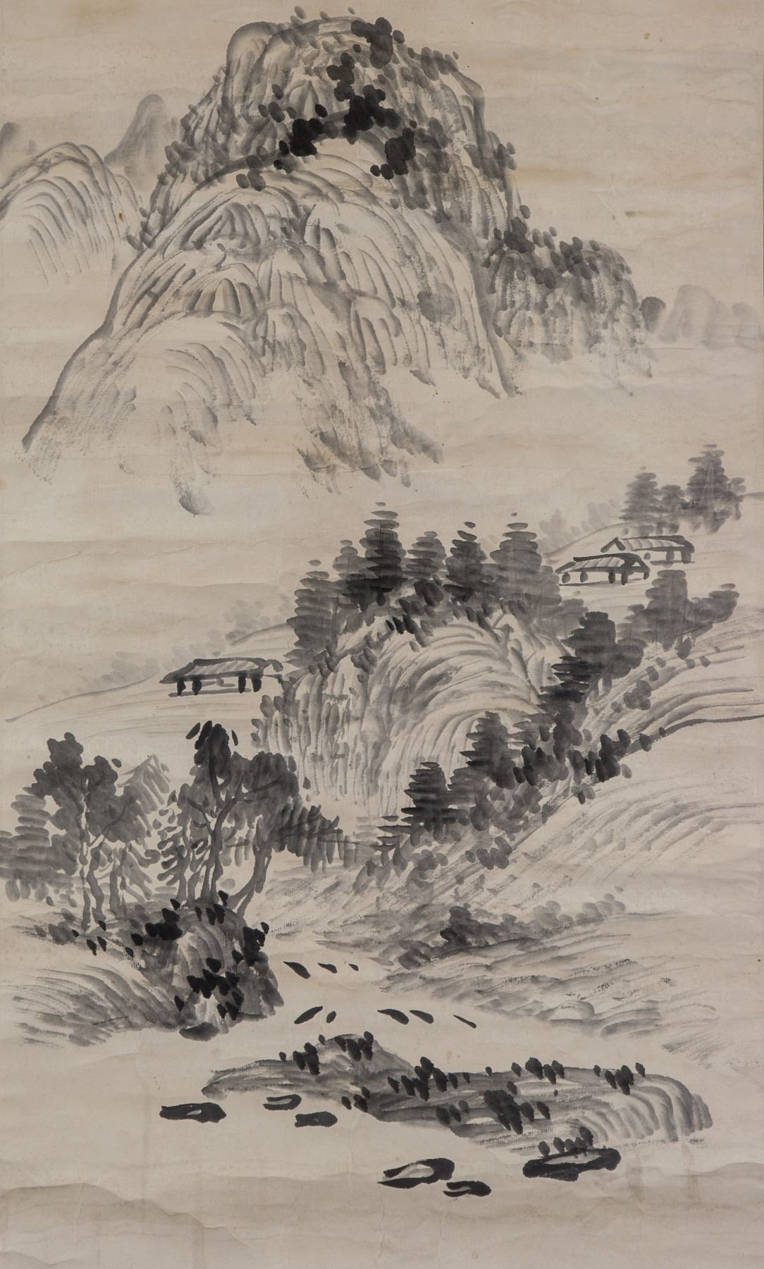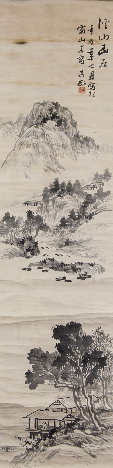 Mountainous landscape; Chinese ink on paper; hanging scroll; signed by artist; inscribed with 1 artist seal; 134 cm x 34 cm; Poor condition; outer side of the painting is torn, ripped fabric, water damage marks, many folds, mold spots; PROVENANCE: Private collection (Okinawa, Japan), thence by descent