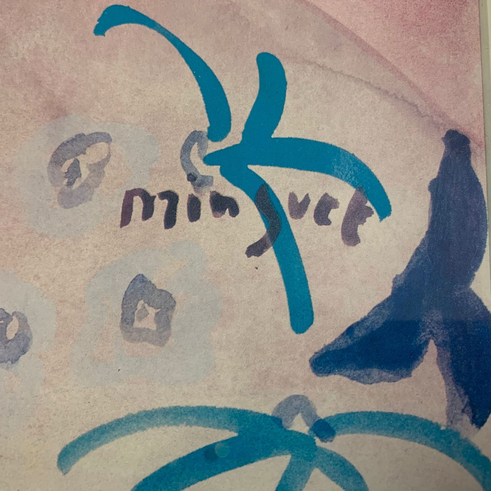 An original watercolour on paper, signed lower right. This piece is of a bouquet of colourful flowers, in a pitcher, resting on a table, against a pink background. This piece has been custom framed under glass.