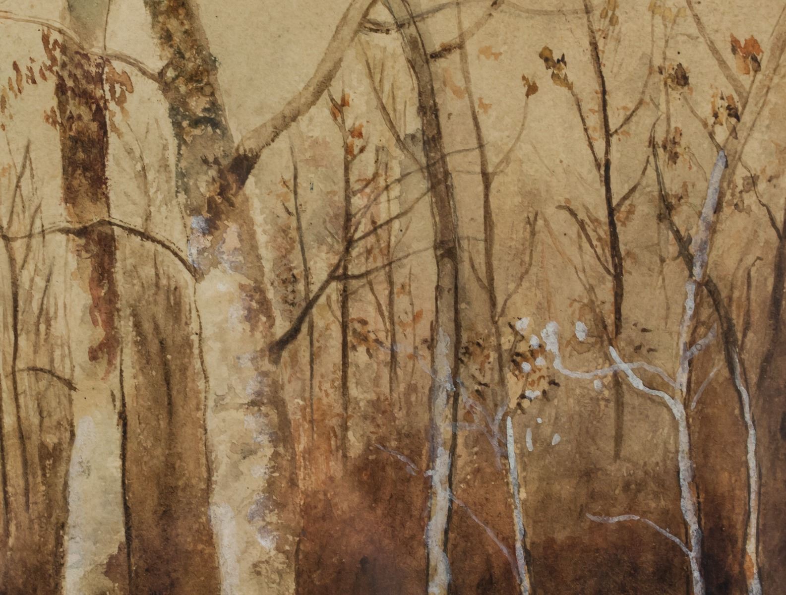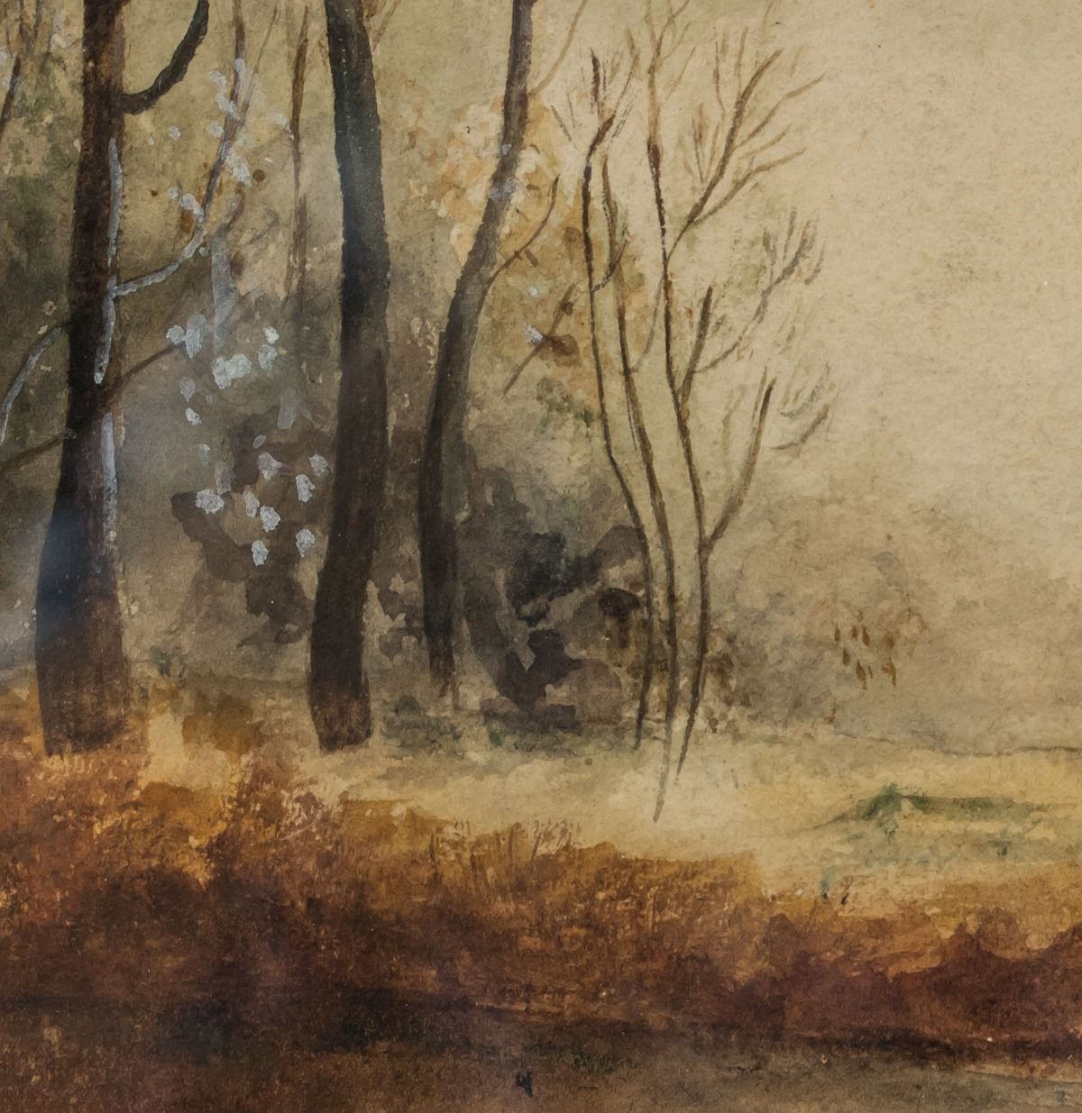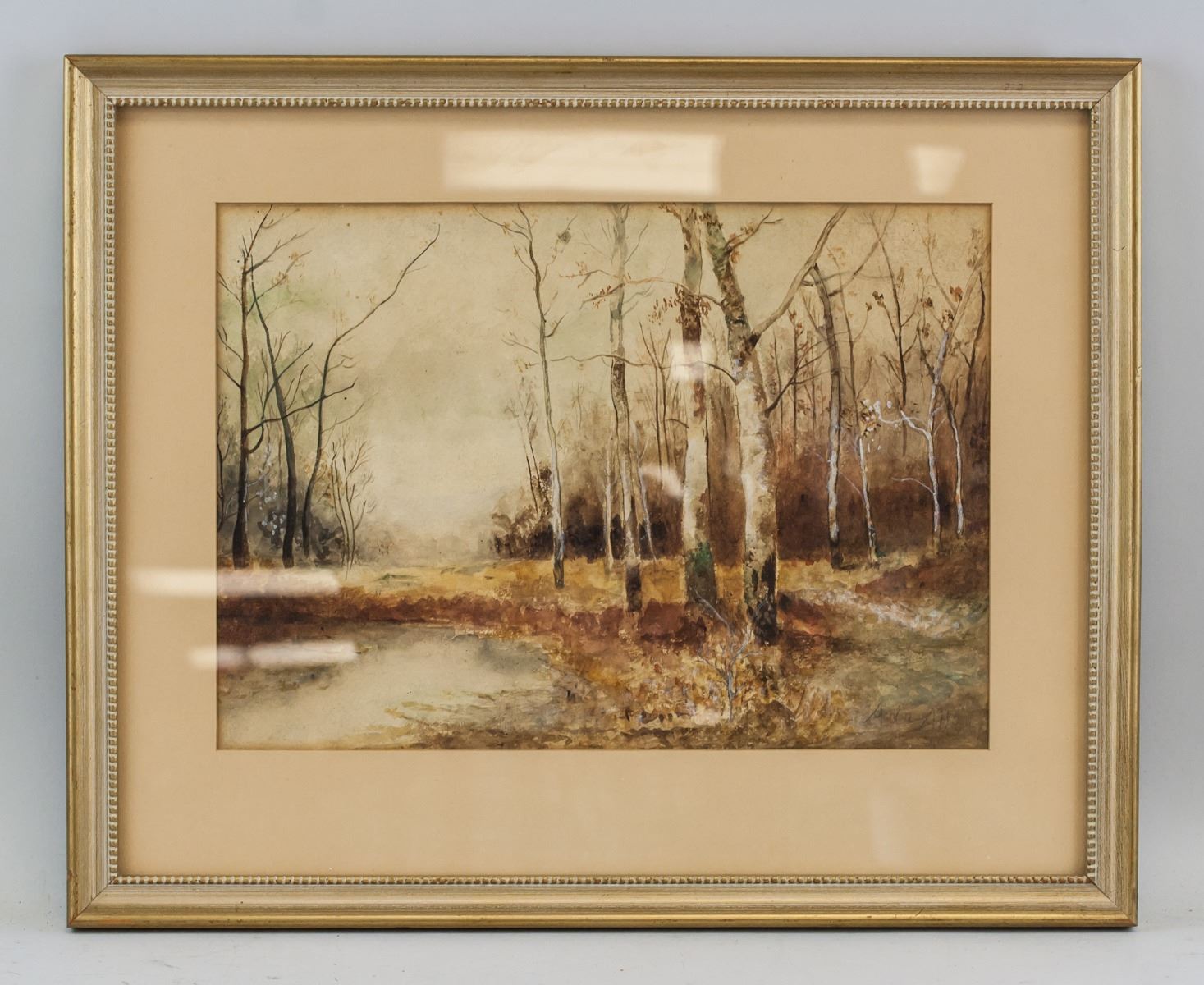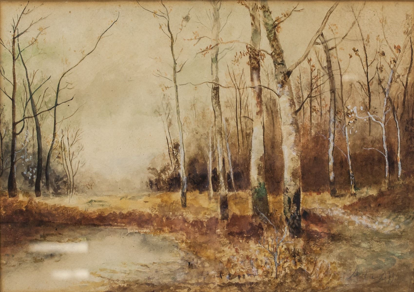 Watercolor on paper, framed. Featuring woodland scene with ponds and leafless trees. Signed Ada Allan in the bottom right corner. Half torn sticker affixed to verso reads "SImpson order NO. R494". 27 x 38 cm (10.75 x 15 in), Frame: 43 x 53 cm (17 x 21 in)