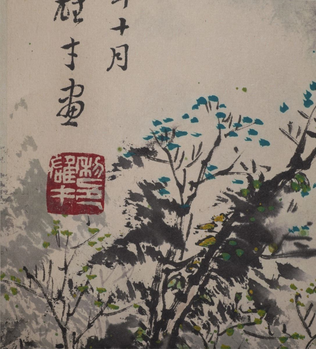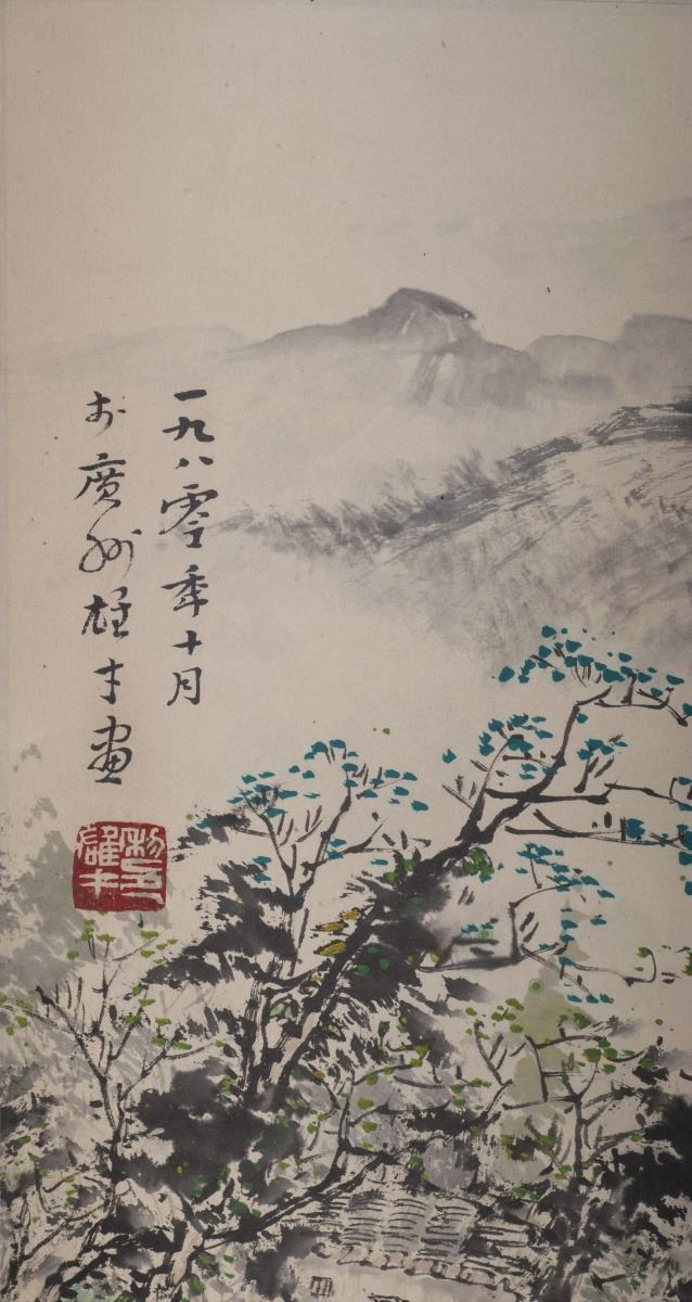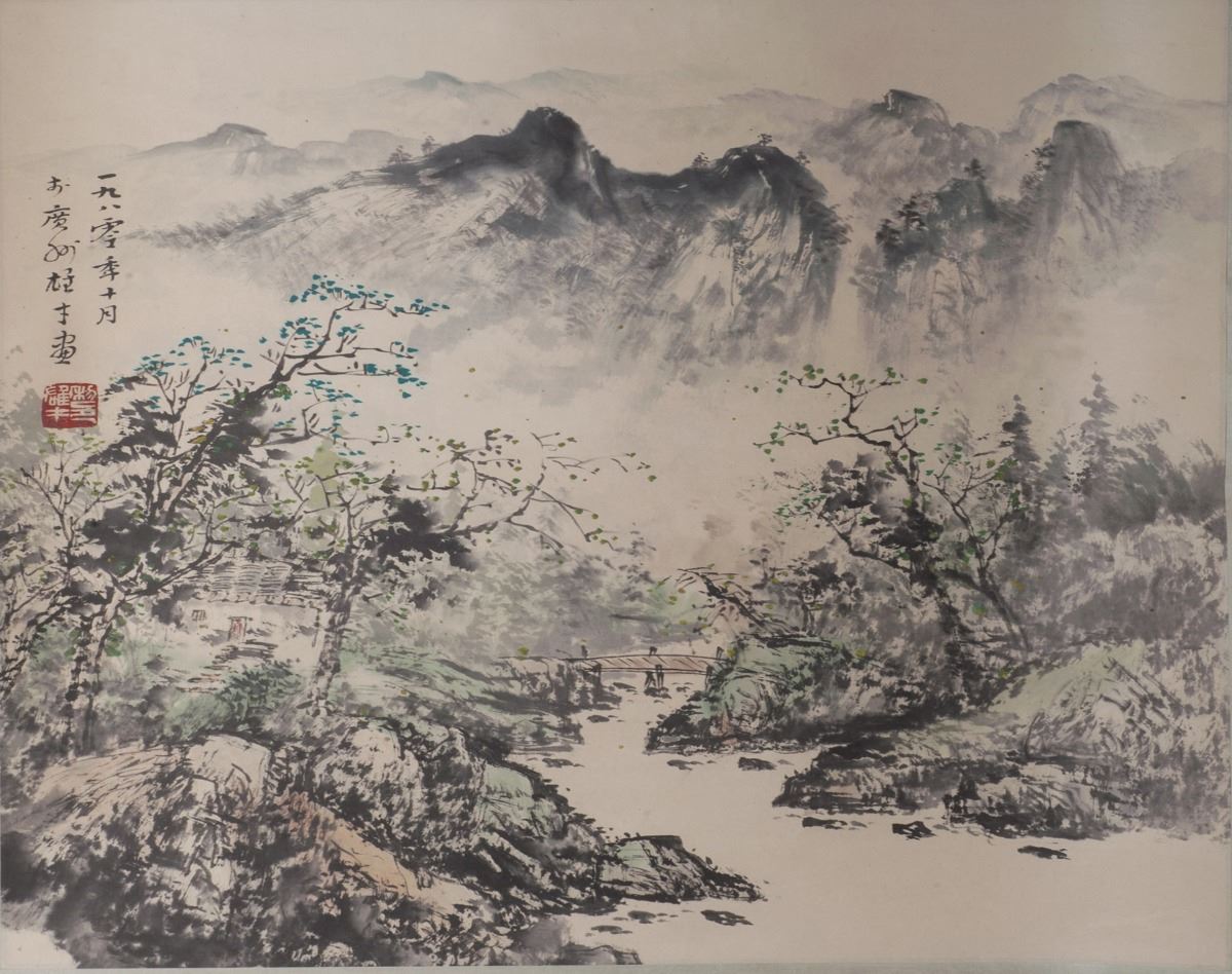 Chinese Ink And Watercolor Painting, Hanging On Scroll, Skillfully Depicted A Scenery Of Mountains, Stream, And Village. Unknown Author.